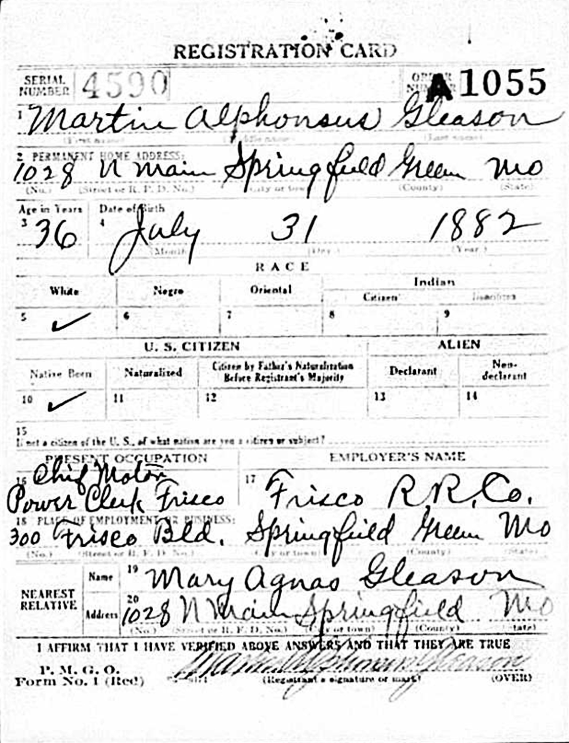 Martin Alphonsus Gleason WWI Draft