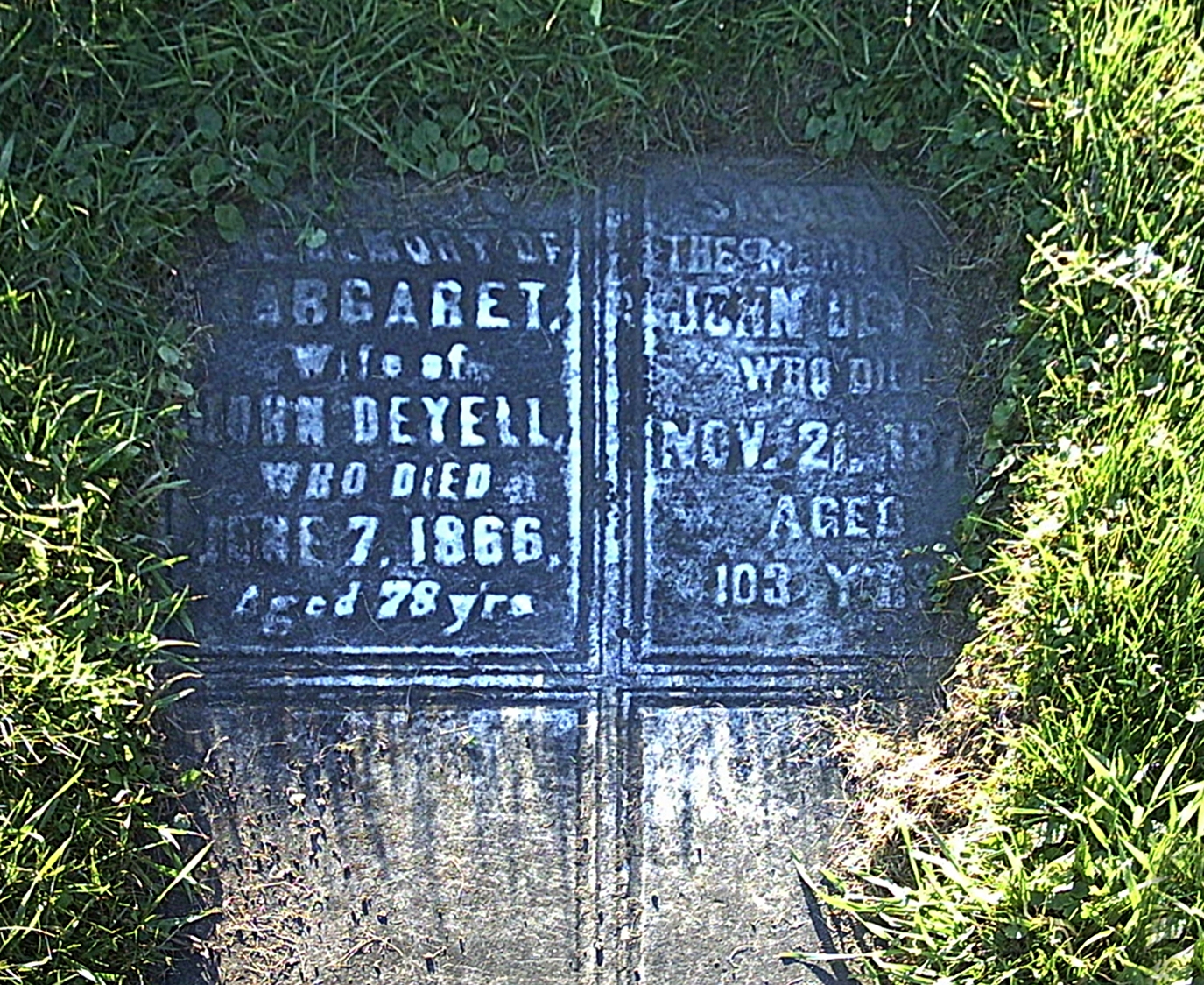 John I. Deyell was born 1775 in Drum, County Monaghan, Ireland, and died November 21, 1878, in Cavan Twp., Durham Co., Ontario, Canada, at age 103. Buried in Centreville Presbyterian Church Cemetery, Peterborough Co., Ontario, Canada. He is the son of Unknown Deyell and Unknown Unknown of Unknown.