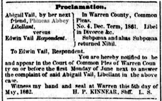 To Edwin Vail, Respondent. You are hereby notified to be and appear in the Court of Common Pleas of Warren County on or before the first Monday of June next to answer the complaint of said Abigail Vail, Libellant in the above case.