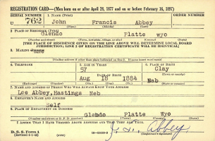 The WWII Draft Registration Report dated April 27, 1942, shows John Francis Abbey (age 57) born August 18, 1884, in Clay County, NE, is Working for Himself, and is living at Glendo, Platte Co., WY. His nearest relative is Lee Abbey, living in Hastings, NE.