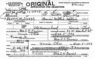 Joseph Sterrett is buried in Stevenson Cemetery (Old Massie's Creek Cemetery), Jones Road, Wilberforce, Greene Co., OH. Thanks to Find-A-Grave for making this image available.