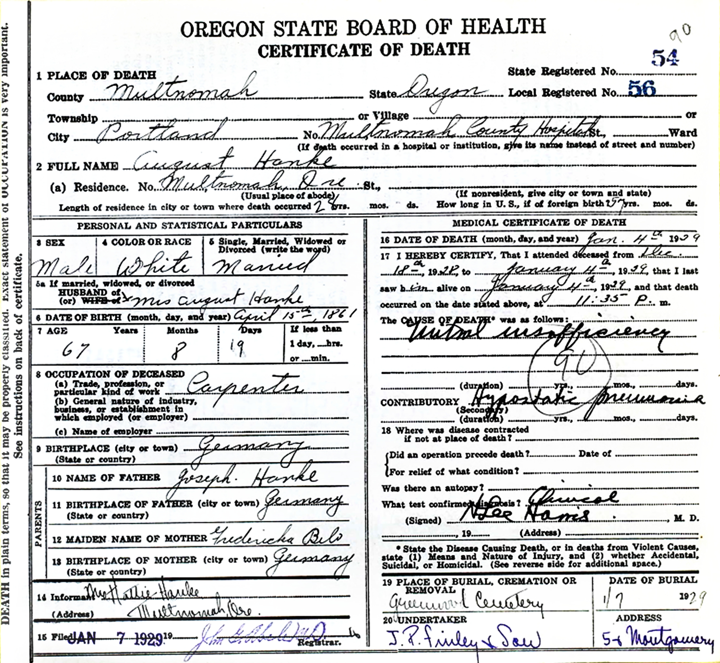 August Frederick Hanke died January 4, 1929, at Multnomah County Hospital, Multnomah, Multnomah Co., OR, at age 67. Buried in Greenwood Hills Cemetery, Portland, Multnomah Co., OR.