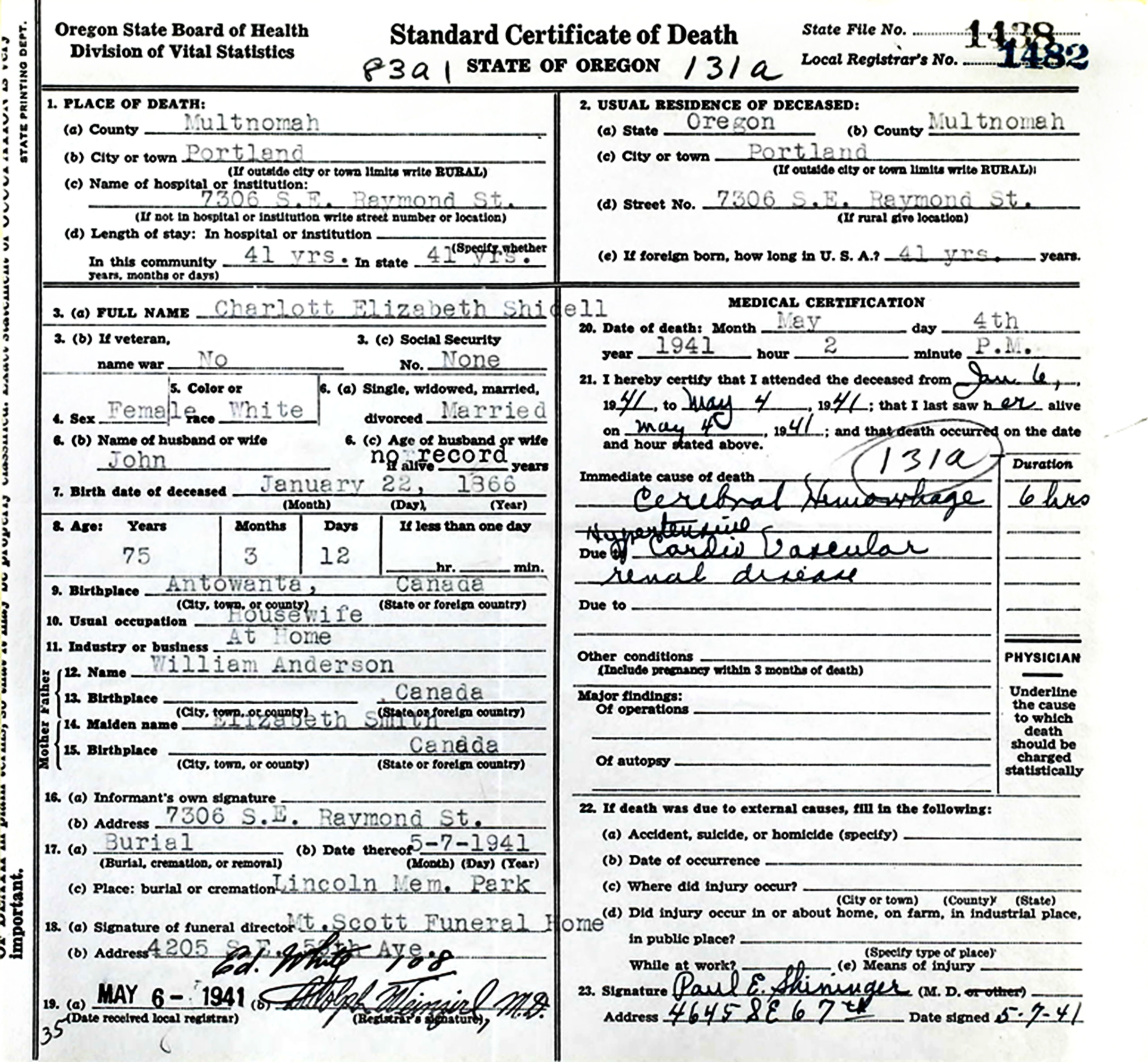 Charlotte Elizabeth "Lottie" (Anderson) (Tempest) Shidell died May 4, 1941, at her home, Portland, Multnomah Co., OR, at age 75. Buried in Lincoln Memorial Park, Portland, Multnomah Co., OR .