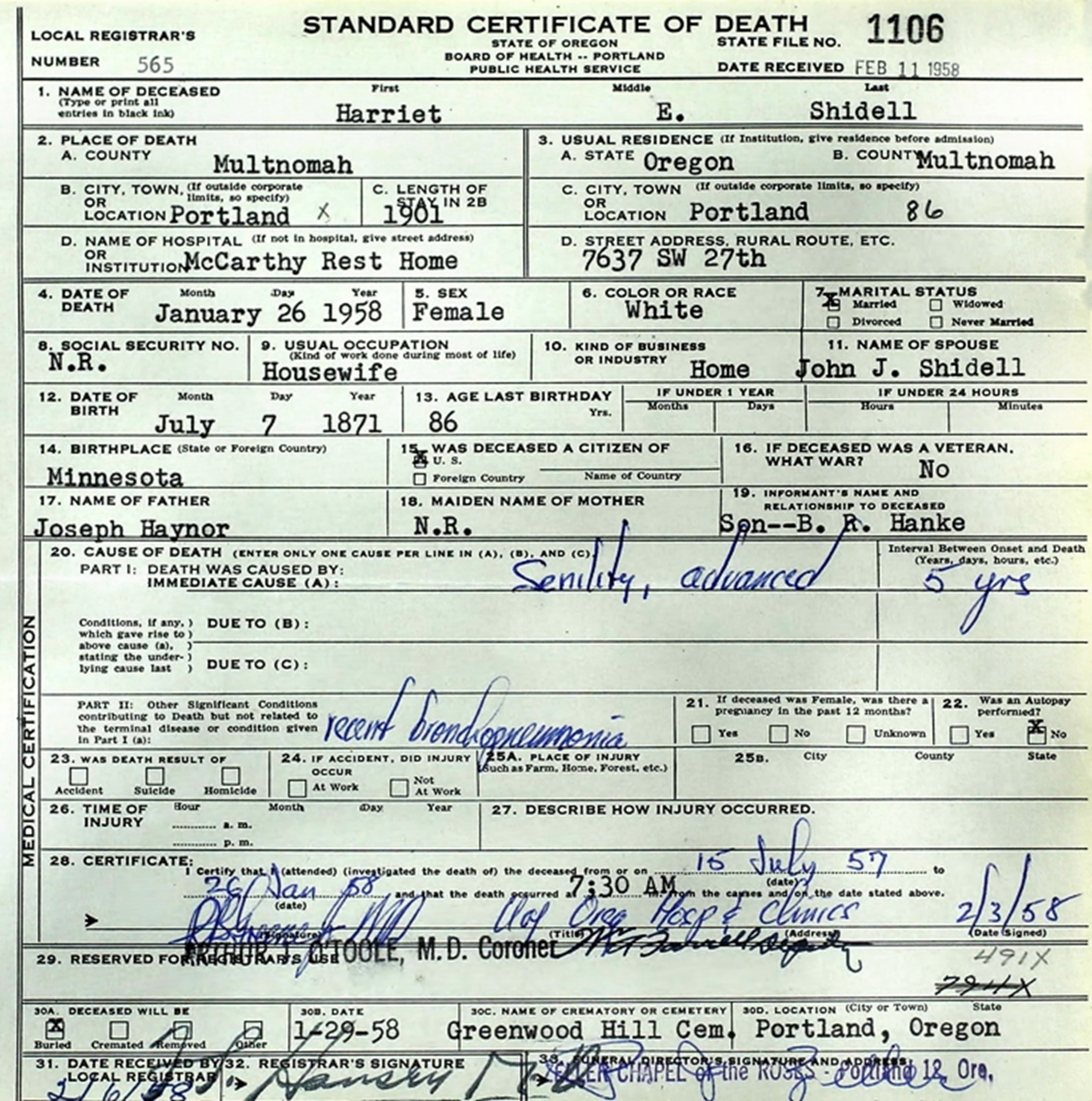 Harriett Eveline "Hattie" (Haynor ) (Ratty) (Hanke) (McLaughlin) (Sutton) Shidell died January 26, 1958, at McCarthy Nursing Home, Portland, Multnomah Co., OR , at age 89. Buried in Greenwood Hills Cemetery, Portland, Multnomah Co., OR.