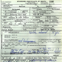 Harriett Eveline "Hattie" Hayner was born July 7, 1868, in Wisconsin, and died January 26, 1958, at McCarthy Nursing Home, Portland, Multnomah Co., OR , at age 89. Buried in Greenwood Hills Cemetery, Portland, Multnomah Co., OR. She is the daughter of Stephen Ramon Hayner of Mill Creek Twp., Erie Co., PA, and Ellen Jane Walker of Wisconsin. She had a brother, Carl A. Haynor, and a sister, Pearl B. (Hayner) Fewell, who died September 7, 1933, in Portland, OR, at age 56.
