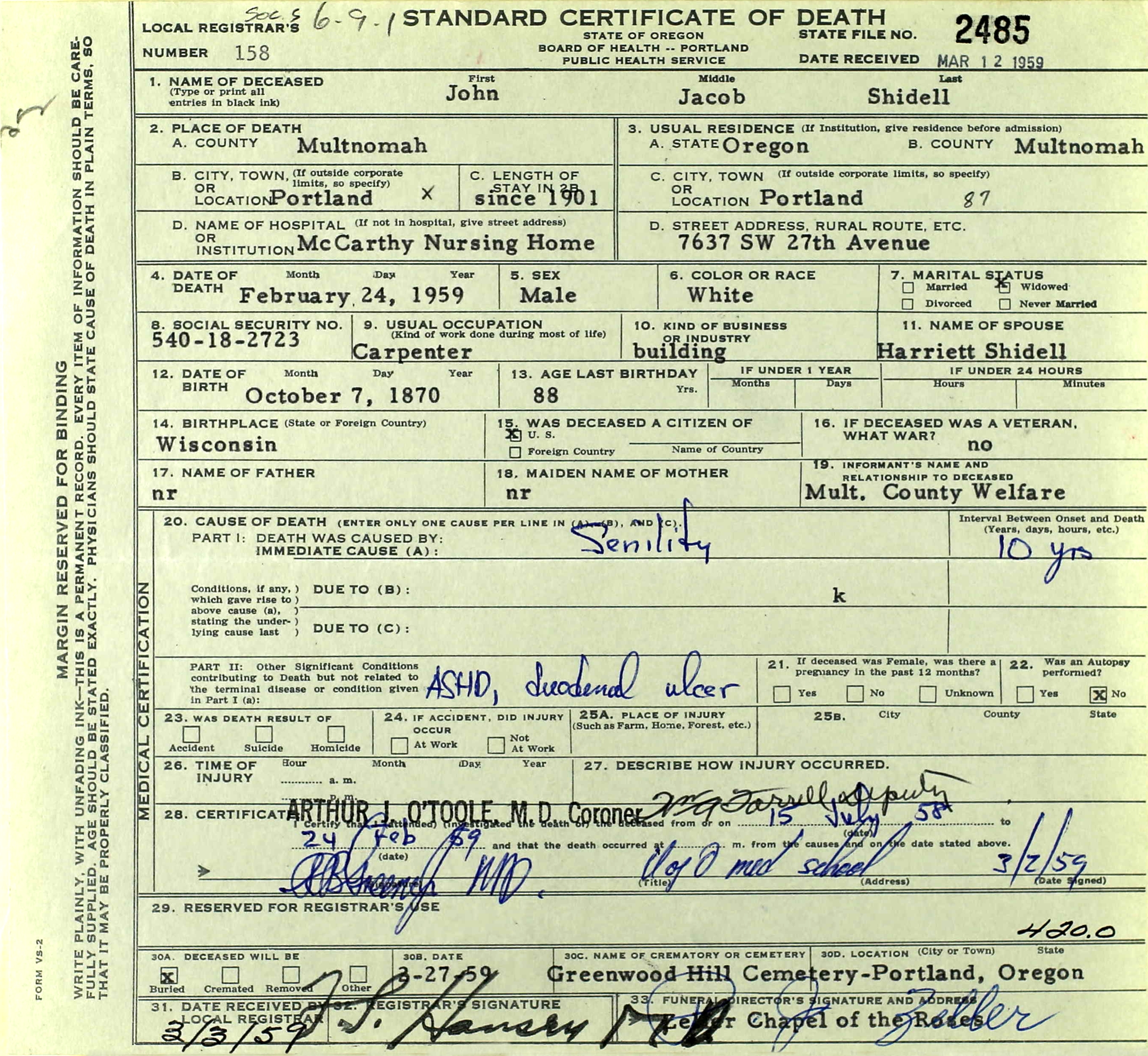 John Jacob Shidell died February 24, 1959, at McCarthy Nursing Home, Portland, Multnomah Co., OR, at age 88. Buried in Greenwood Hills Cemetery, Portland, Multnomah Co., OR.