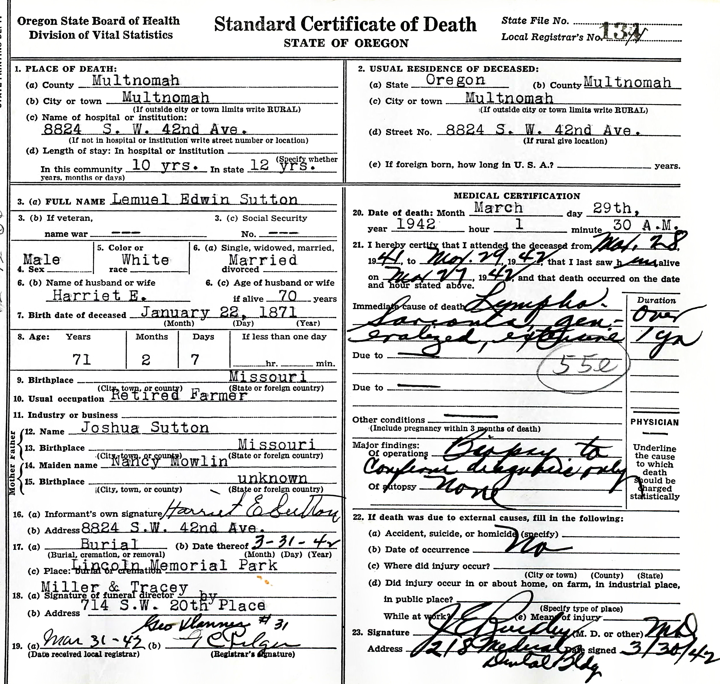 The 1940 U. S. Census taken on April 25, 1940, shows Lemuel E. Sutton (age 69) born in Missouri, and 5 years ago was living in the Same Place, and with 8 years of School, is a married Head of Household, and is living on Route 6, West Portland, Multnomah Co., OR. Living with him is his wife, Harriet E. Sutton (age 71) born in Minnesota, and 5 years ago was living in the Same Place, and with 2 years of High School.