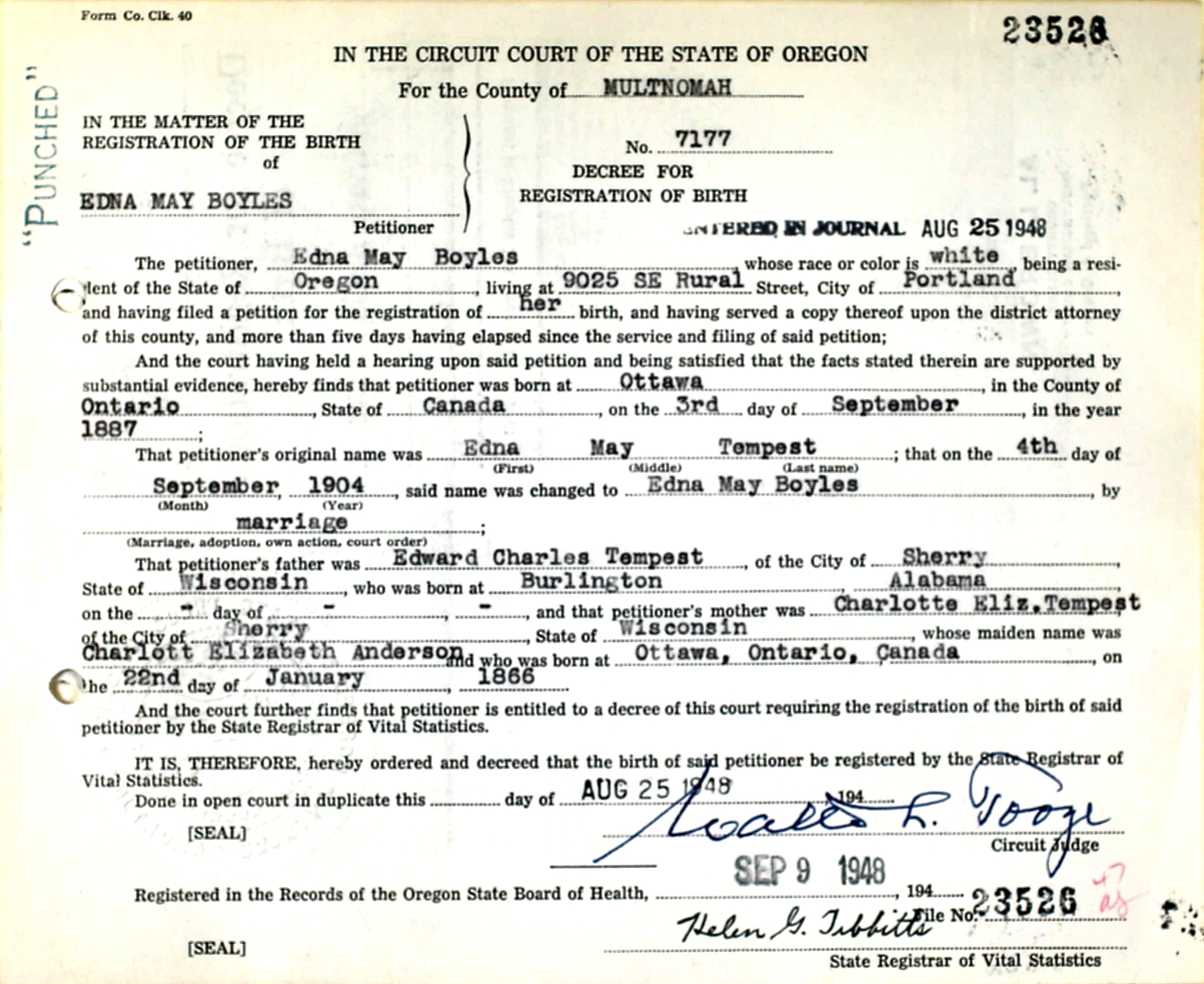 - Edna May Tempest: Born September 3, 1887, in Ottawa, Ontario, Canada; Died November 17, 1975, at a local nursing home, Portland, Multnomah Co., OR (age 88). Immigrated in 1891. Married September 4, 1904, 1904, in Multnomah Co., OR, to George Benjamin Boyles: Born November 24, 1883, in Pennsylvania; Died February 1, 1951, in Portland, Multnomah Co., OR (age 67). George was a Ship Carpenter in 1918 and a House Carpenter in 1920. Gertrude M. Boyles and Harry Haugland were married December, 1928, in Portland, Multnomah Co., OR.