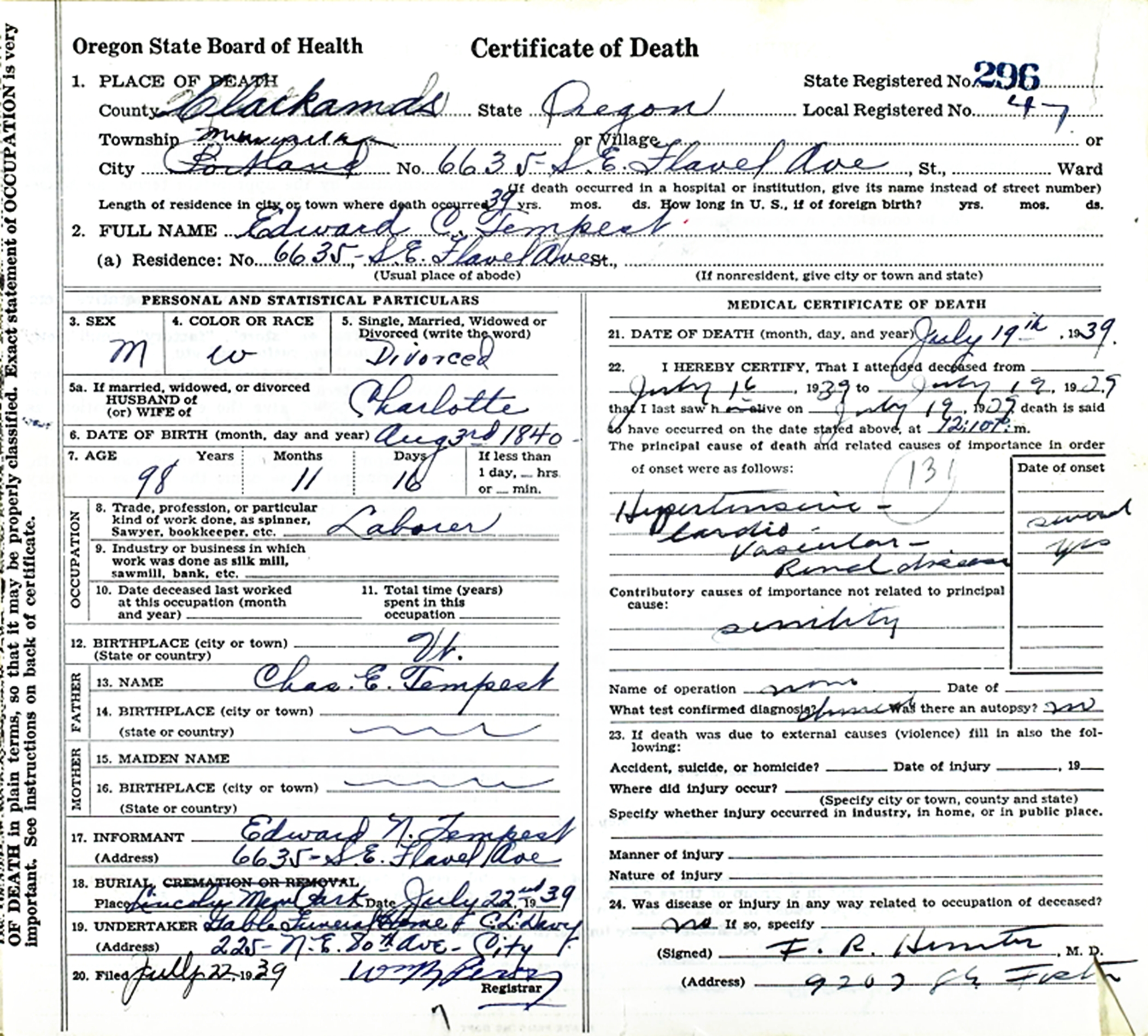 Edward Charles Tempest died July 19, 1939, at his home, Portland, Multnomah Co., OR, at age 94. Buried in Lincoln Memorial Park, Portland, Multnomah Co., OR .