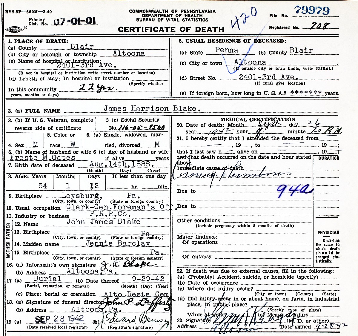 James Harrison Blake died September 26, 1942, in Altoona, Blair Co., PA, at age 54. Buried in Alto Reste Burial Park, Altoona, Blair Co., PA.