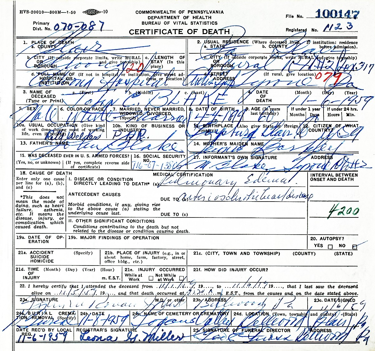 John C. Blake died November 6, 1959, at Altoona Hospital, Altoona, Blair Co., PA (age 60). Buried in Logan Valley Cemetery, Bellwood, Blair Co., PA.