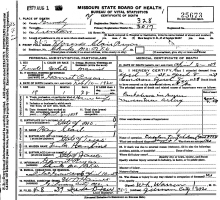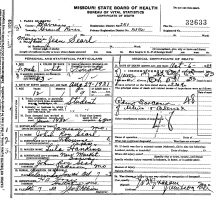 - Gertrude Arlene Searl: Born July 9, 1913, in Corning, Adams Co., IA; Died December 5, 2005, at Mercy Medical Center, Long Term Care, Centerville, Appanoose Co., IA (age 92). Buried in Hickory Creek Cemetery, Washington Twp., Daviess Co., MO. Married December 25, 1938, in Jameson, Daviess Co., MO, to Delaine Taylor Lary: Born December 13, 1909, in Mt. Moriah, Trail Creek Twp., Harrison Co., MO; Died November 25, 2002, in Centerville, Appanoose Co., IA (age 92). Buried in Hickory Creek Cemetery, Washington Twp., Daviess Co., MO.