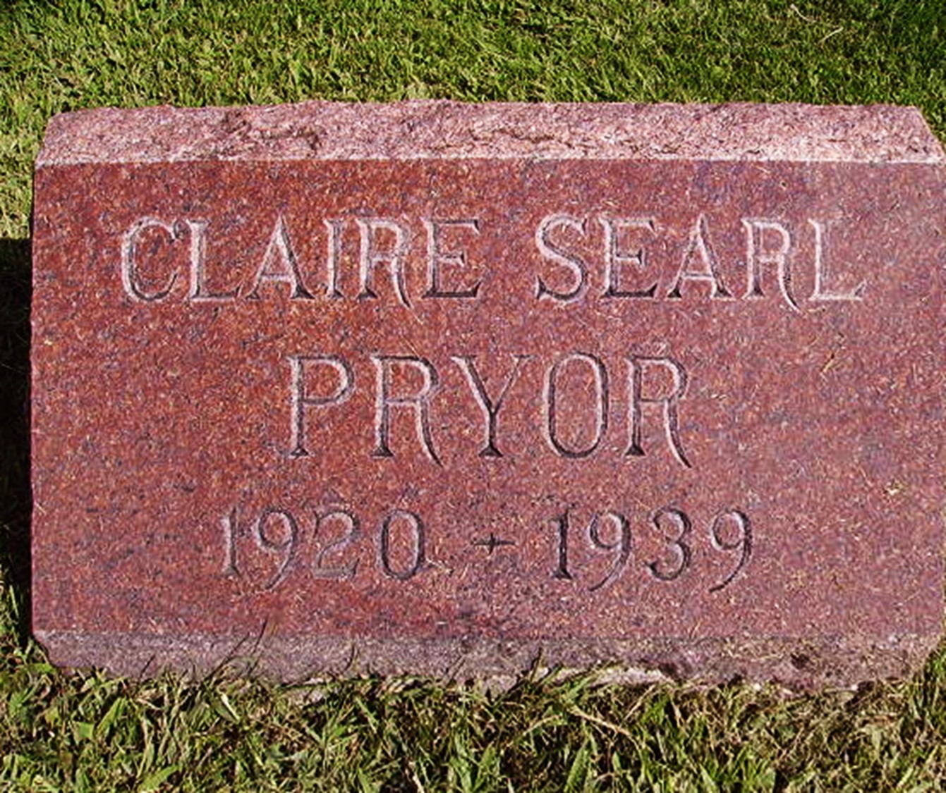 Florence Claire (Searl) Pryor died April 8, 1939, in Trenton, Grundy Co., MO, at age 19. Buried in Pilot Grove Cemetery #1, Pilot Grove, Daviess Co., MO.