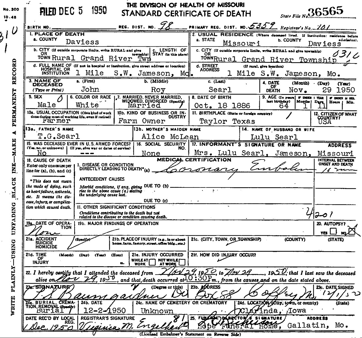 John Roy Searl was born October 18, 1886, in Florence, Williamson Co., TX, and died November 29, 1950, in rural Grand River Twp., Daviess Co., MO, at age 64. Buried in Clarinda Cemetery, Clarinda, Nodaway Twp., Page Co., IA. He is the son of Thomas Greenfield Searl of in Ashton, Durham Co., Canada West, and Jemima Alice "Addie" McLean of Johnson Co., IN.