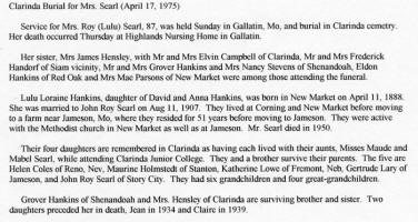 Lulu Loraine (Hankins) Searl died April 17, 1975, at Highlands Nursing Home, Gallatin, Daviess Co., MO, at age 87. Buried in Clarinda Cemetery, Clarinda, Nodaway Twp., Page Co., IA.