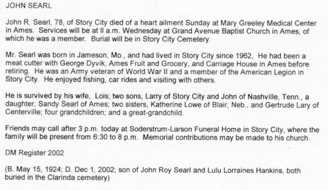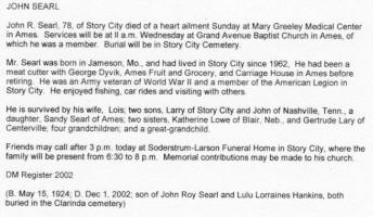 John Roy "Jack" Searl Jr. died December 1, 2002, at Mary Greeley Medical Center, Ames, Story Co., IA, at age 78. Buried in Story City Cemetery, Story City, Story Co., IA.