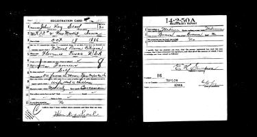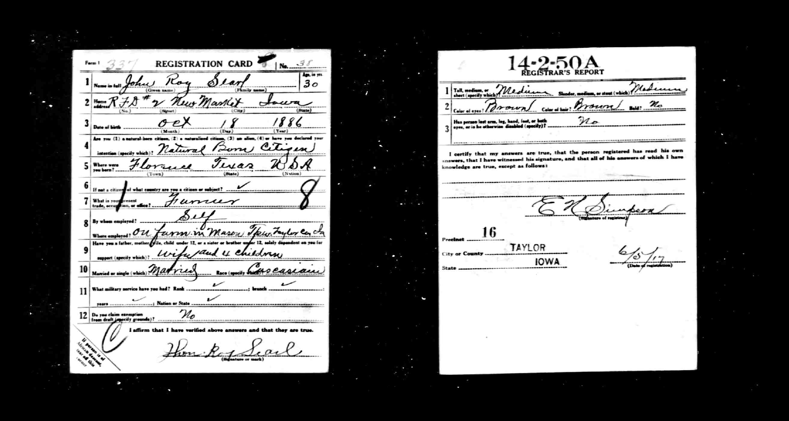 The WWI Draft Registration Report dated June 5, 1917, shows John Roy Searl was born October 18, 1886, in Florence, TX, and is living at RFD #2, New Market, IA.