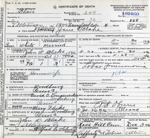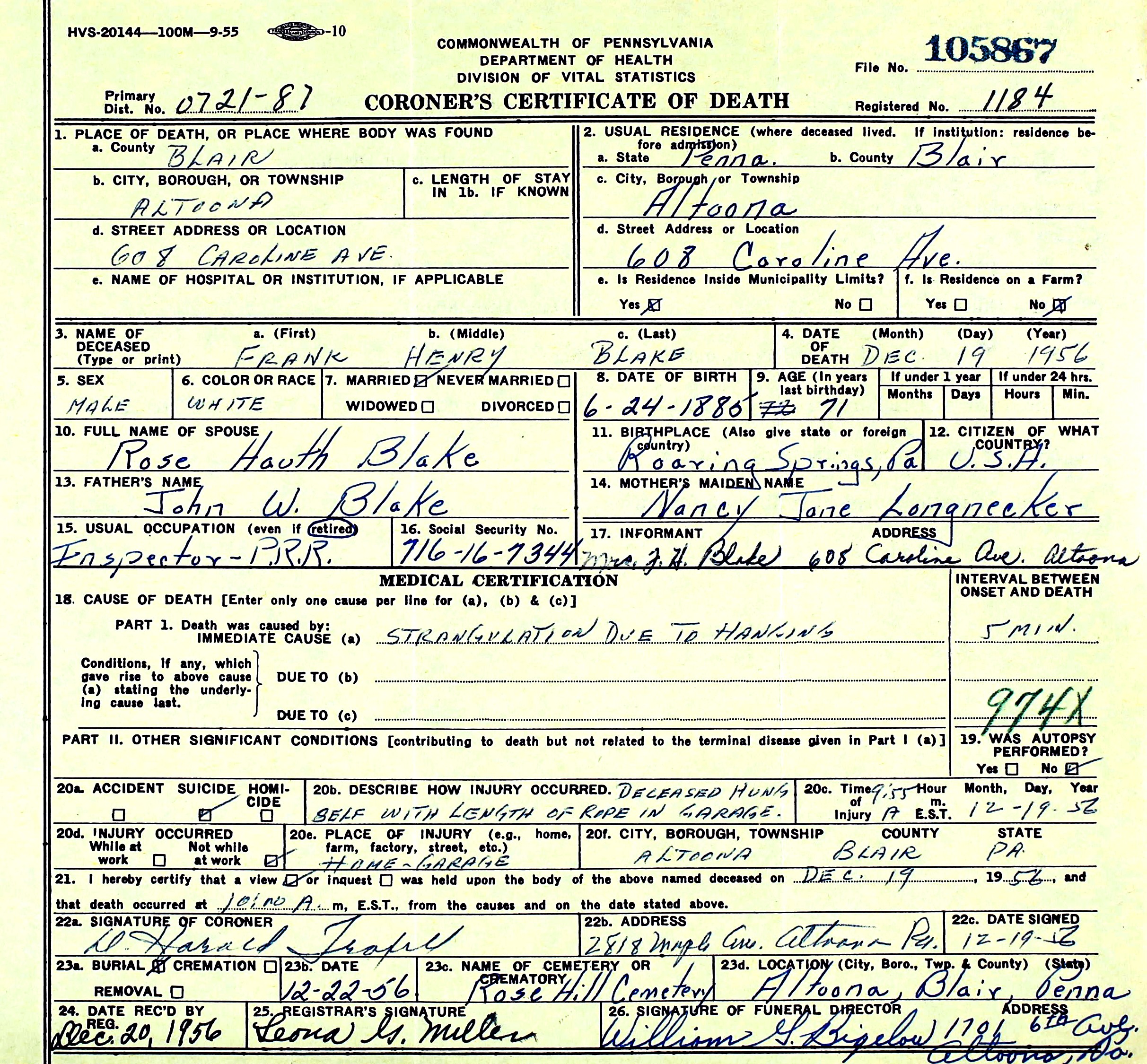 Franklin Henry "Frank" Blake died by suicide December 19, 1956, in Altoona, Blair Co., PA, at age 71. Buried in Rose Hill Cemetery, Altoona, Blair Co., PA.