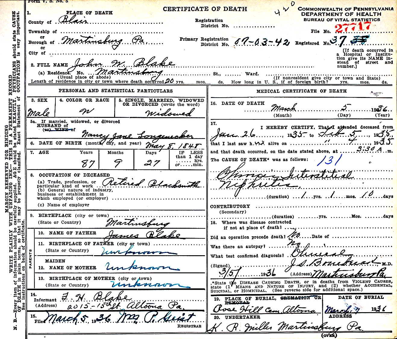 The 1920 U. S. Census taken on January 4, 1920 shows John W. Blake (age 71) born in Pennsylvania to Pennsylvania-born parents is a Fruit Farm Farmer owning his own home free of a mortgage and is living on North Market Street, Martinsburg Borough, Blair Co., PA. Living with him is his wife, Nancy Blake (age 74) born in Pennsylvania to Pennsylvania-born parents. Also living there is his married sister: Mary E. Ridenour (age 58) born in Pennsylvania to Pennsylvania-born parents.