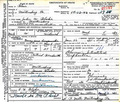 The 1930 U. S. Census taken on April 9, 1930 shows John Blake (age 81) born in Pennsylvania to Maryland and Pennsylvania-born parents is a widower head of household owning his own home on North Market Street, Martinsburg Borough, Blair Co., PA. Living with him is his widowed sister, Mary Ridenour (age 69) born in Pennsylvania to Maryland and Pennsylvania-born parents, who is a Housekeeper. Also living there is John's nephew, James Ridenour (age 32) born in Pennsylvania to Pennsylvania-born parents, and first married at age 24, who is a Clerk at Rail Road Shops.