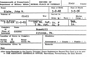 John W. P. Blake died March 5, 1936, in Martinsburg, Bedford (Blair) County, PA, at age 87. Buried in Rose Hill Cemetery, Altoona, Blair Co., PA.