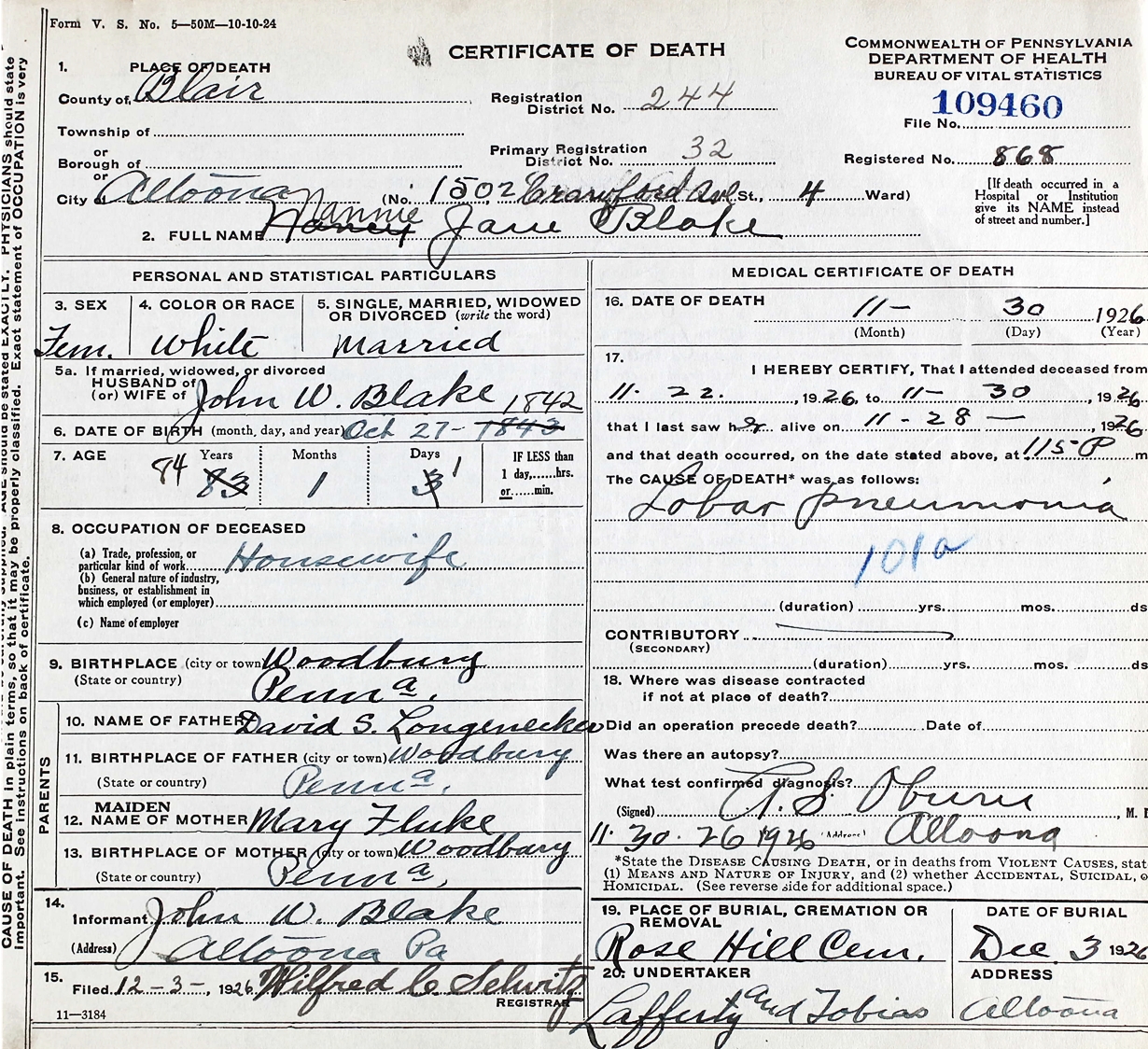 Nancy Jane (Longenecker) Blake died November 30, 1926, at the family residence, 1502 Crawford avenue, Altoona, Blair Co., PA, at age 8 4. Buried in Rose Hill Cemetery, Altoona, Blair Co., PA.