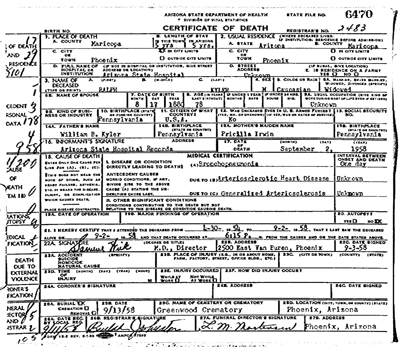 Ralph Irwin Kyler died September 2, 1958, at Arizona State Hospital, Phoenix, Maricopa Co., AZ, at age 78. Buried in City of Mesa Cemetery, Mesa, Maricopa Co., AZ.