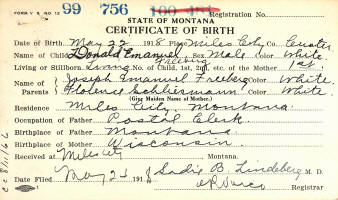Donald Emanuel "Don" Freeberg: Born May 22, 1918, in Miles City, Custer Co.,