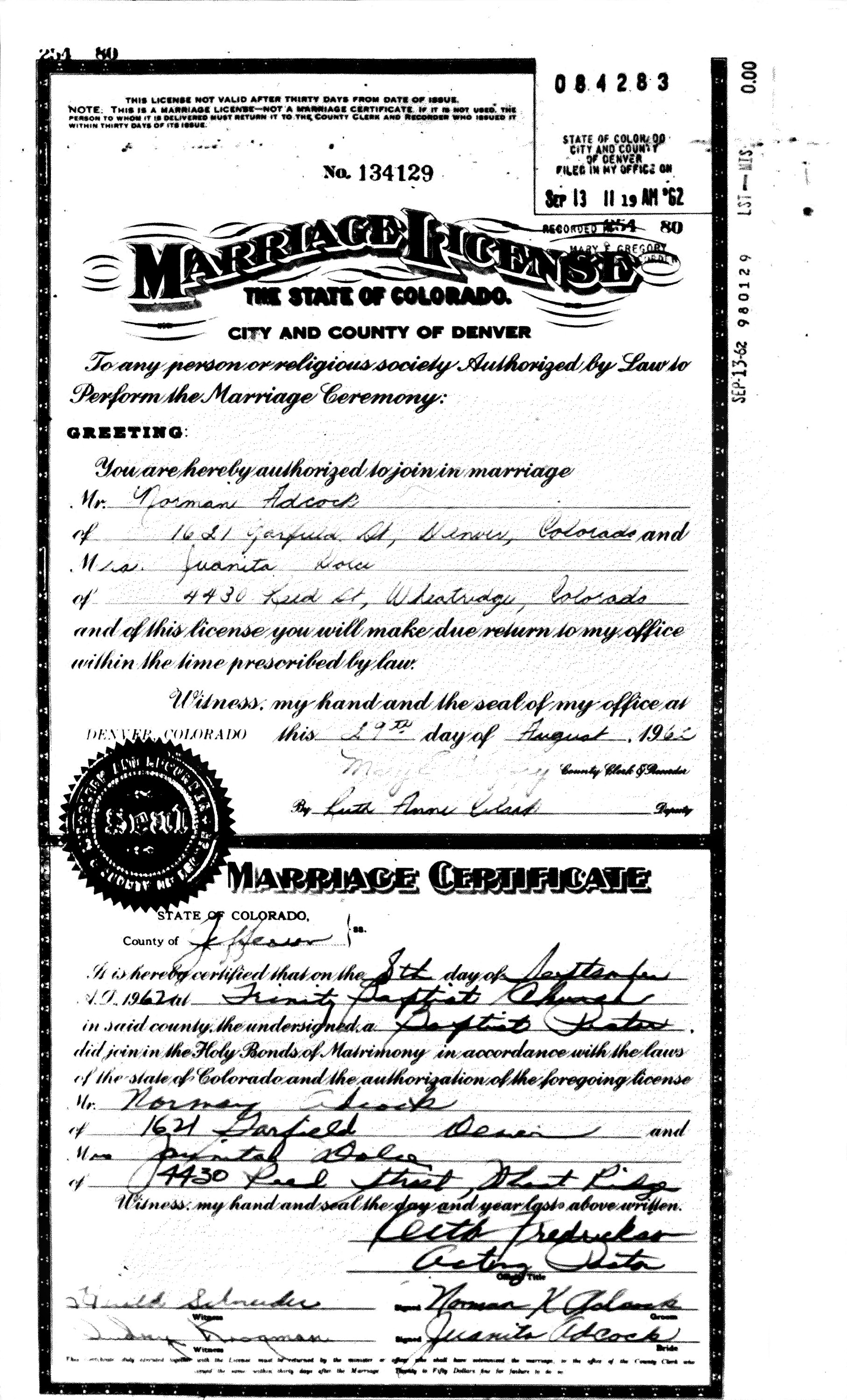 Adcock of Longmont, Colorado. He is survived by the love of his life, Juanita,
