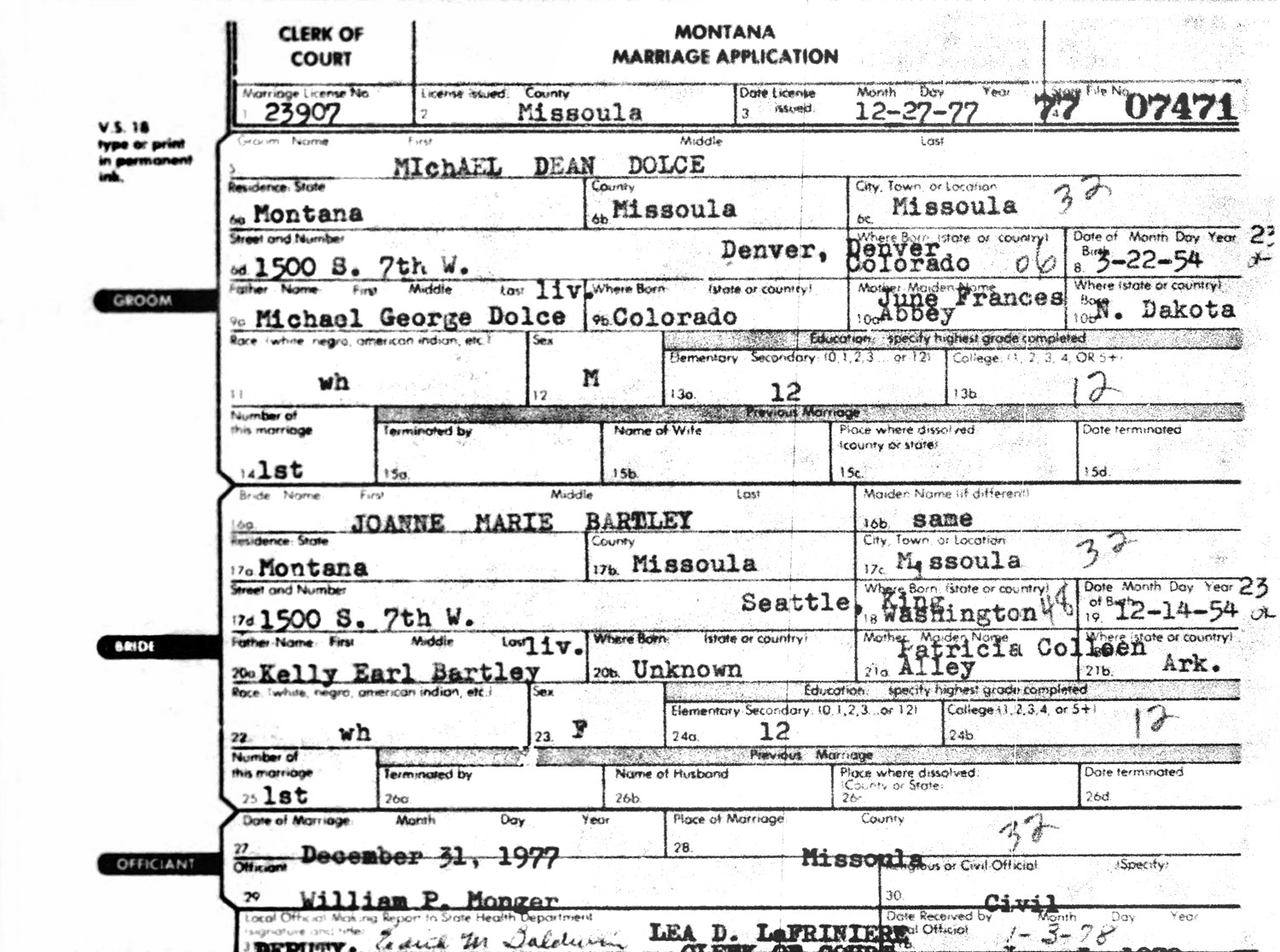 Jarzyna of Billings MT, stepson Gary Lee Adcock of Longmont CO, son Michael Paul