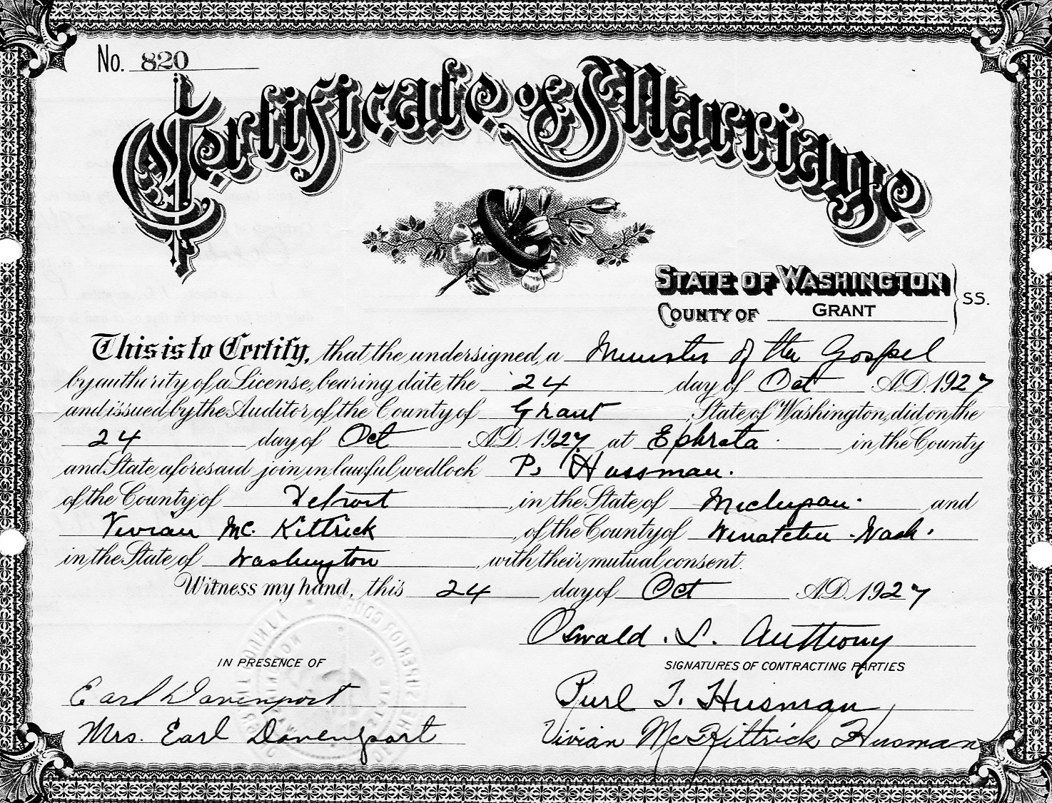 Purl Theodore "Ted" Husman, a bachelor, and Vivian McKittrick, a maiden, were married October 24, 1927, in Ephrata, Grant Co., WA.
