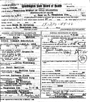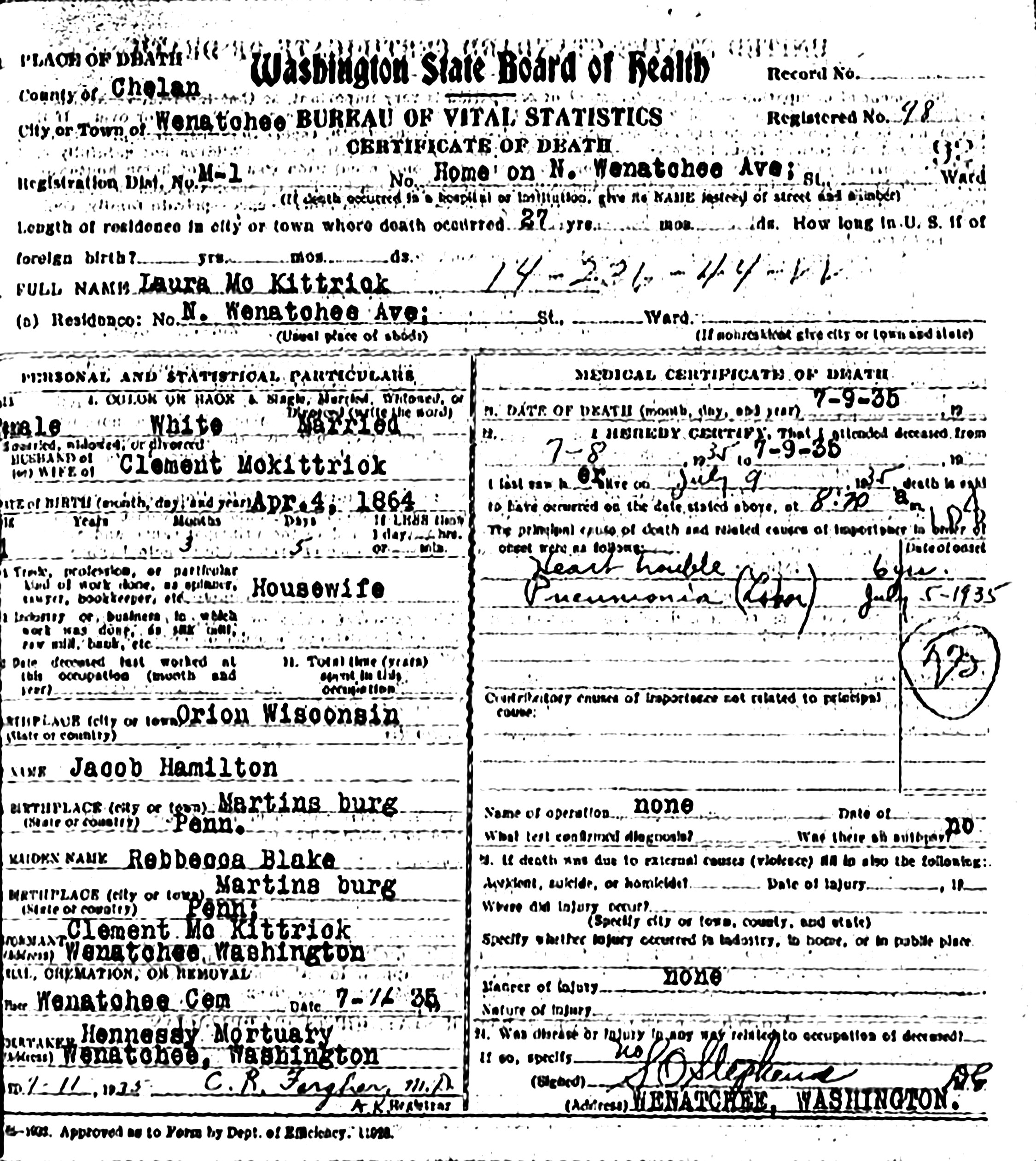 Laura M. (Hamilton) McKittrick died July 9, 1935, in Wenatchee, Suburban Pct., Chelan Co., WA, at age 71. Buried in Wenatchee City Cemetery, Wenatchee, Chelan Co., WA.