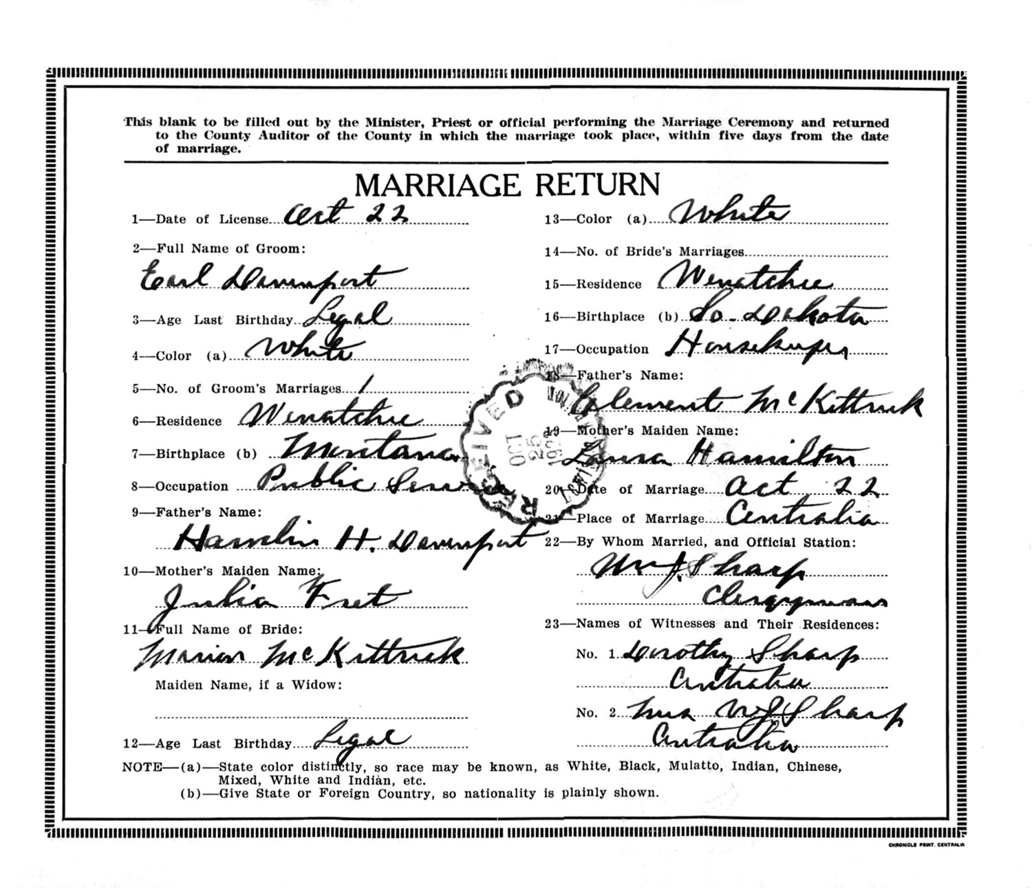 Earl Roy Davenport, a bachelor, and Marion McKittrick, a maiden, were married October 22, 1923, in Centralia, Wenatchee Co., WA.