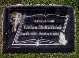 Vivian McKittrick went to be with the Lord on Oct. 8, 2005. Vivian reached the grand age of 100 years. She lived in Hesperia for well over 40 years, and her many friends and her dogs will miss her greatly. Vivian was a teacher and loved to travel, especially to the Far East. She achieved many goals in her life, and she made an impression on everyone she met. She is survived by her great-nephews Robert, William and Jim Davenport and her grand-niece, June Davenport Lovenger. Vivian gave her life to Jesus Christ and had faith in his redemption. Graveside services will be held at 9 a.m. Friday at Victor Valley Memorial Park, 15609 Eleventh Street in Victorville. Kern Hesperia Mortuary is handling arrangements.