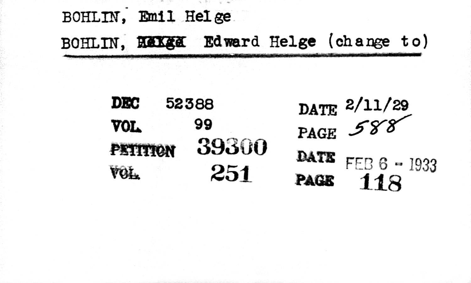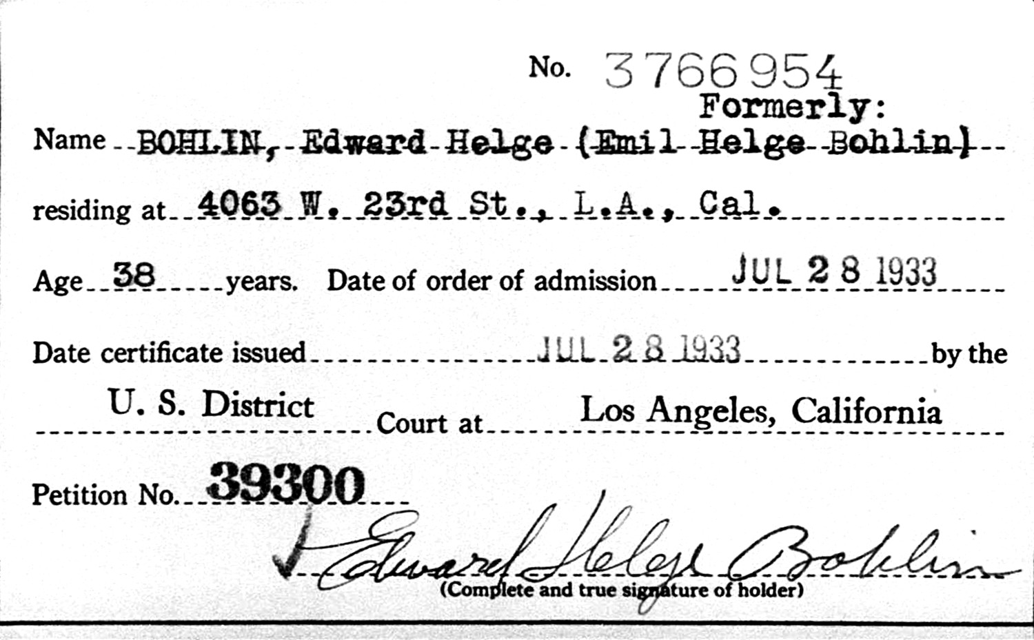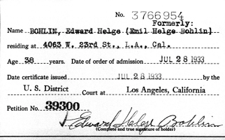 Emil Helge "Edward/Ed" Bohlin applied for U. S. Citizenship on February 11, 1929, and became a Naturalized U. S. Citizen on July 28, 1933, in U. S. District Court, Los Angeles, Los Angeles Co., CA.