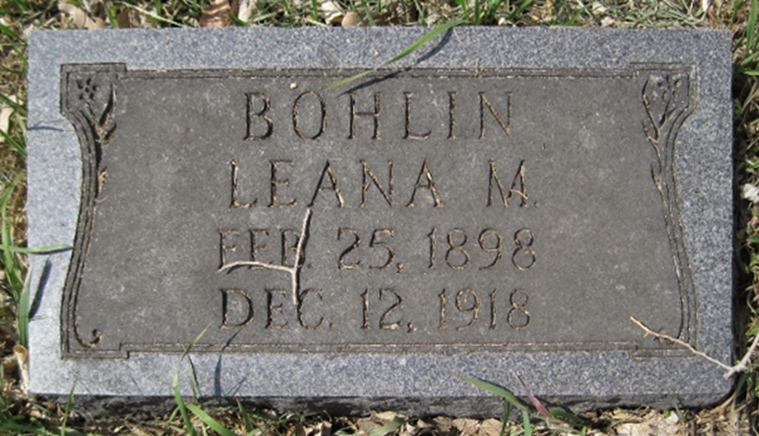 Leana Maria (Freeberg) Bohlin died December 12, 1918, in or near Cody, Park Co., WY, at age 20, due to influenza. She is buried next to her mother in Miles City Cemetery, Miles City, Custer Co., MT.