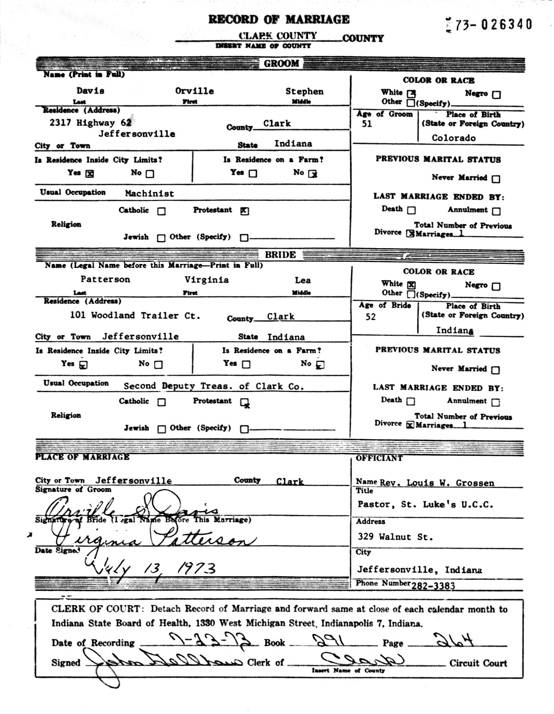 Orville Stephen Bohlin and Virginia Lea (Patterson) Cooper were married July 13, 1973, in Jeffersonville, Clark Co., IN .