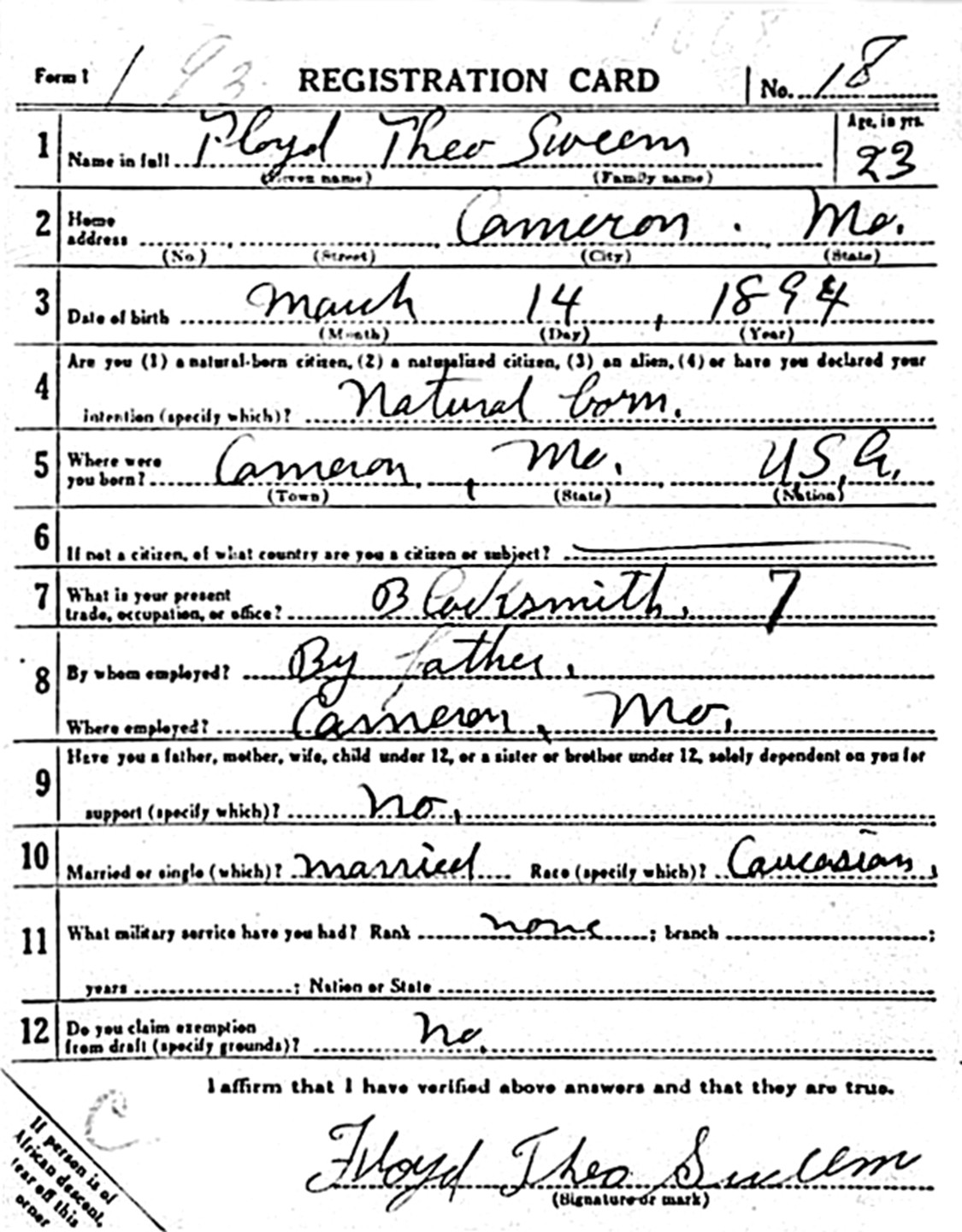 The WWI Draft Registration Report dated June 5, 1917, shows Floyd Theo Sweem, age 23, born March 14, 1894, in Cameron, MO, is a married Blacksmith employed by his father, and living in Cameron, MO.