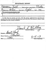 Orville Stephen Bohlin : Born September 1, 1921, in R. F. D., No. College, Larimer Co., CO ; Died September 24, 1997, at Transcare Rehab Center, Jeffersonville, Clark Co., IN (age 76). Buried in Walnut Ridge Cemetery, Jeffersonville, Clark Co., IN. Married July 13, 1973, in Jeffersonville, Clark Co., IN, to Virginia Lea (Patterson) Cooper: Born January 28, 1921, in Jeffersonville, Clark Co., IN; Died November 13, 2006, at Clark Memorial Hospital, Jeffersonville, Clark Co., IN (age 85). Buried in Walnut Ridge Cemetery, Jeffersonville, Clark Co., IN. Orville was adopted by Willard D. Davis and assumed the last name of Davis.