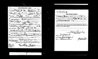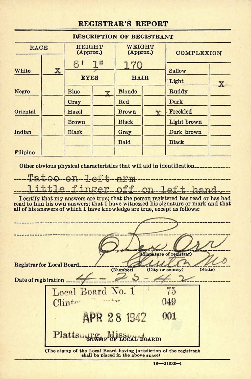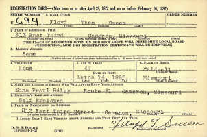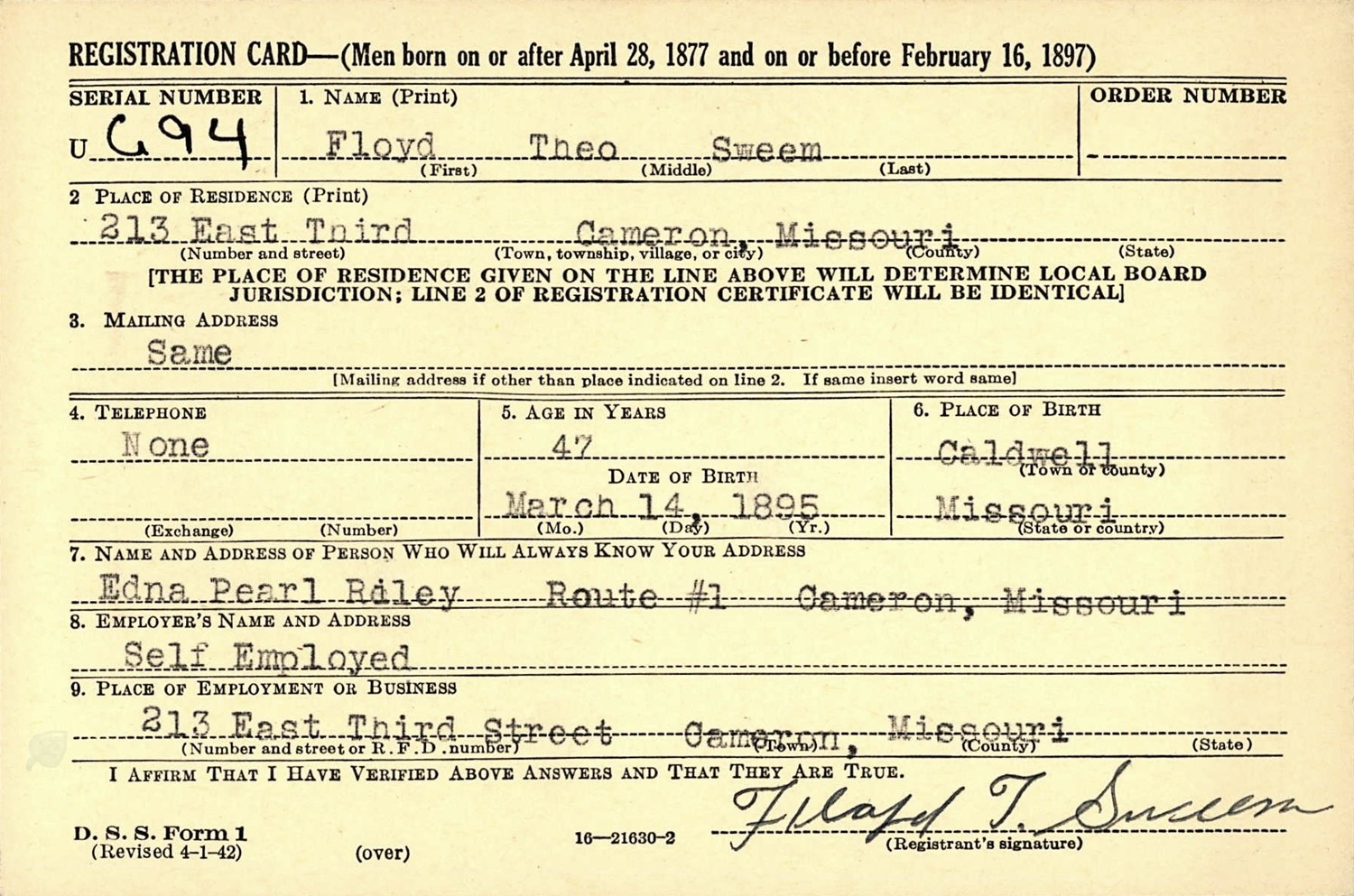 The WWII Draft Registration Report dated April 28, 1942, shows Floyd Theo Sweem, age 47, born March 14, 1895, in Caldwell, MO, is self employed, and living at 213 East Third, Cameron, MO.