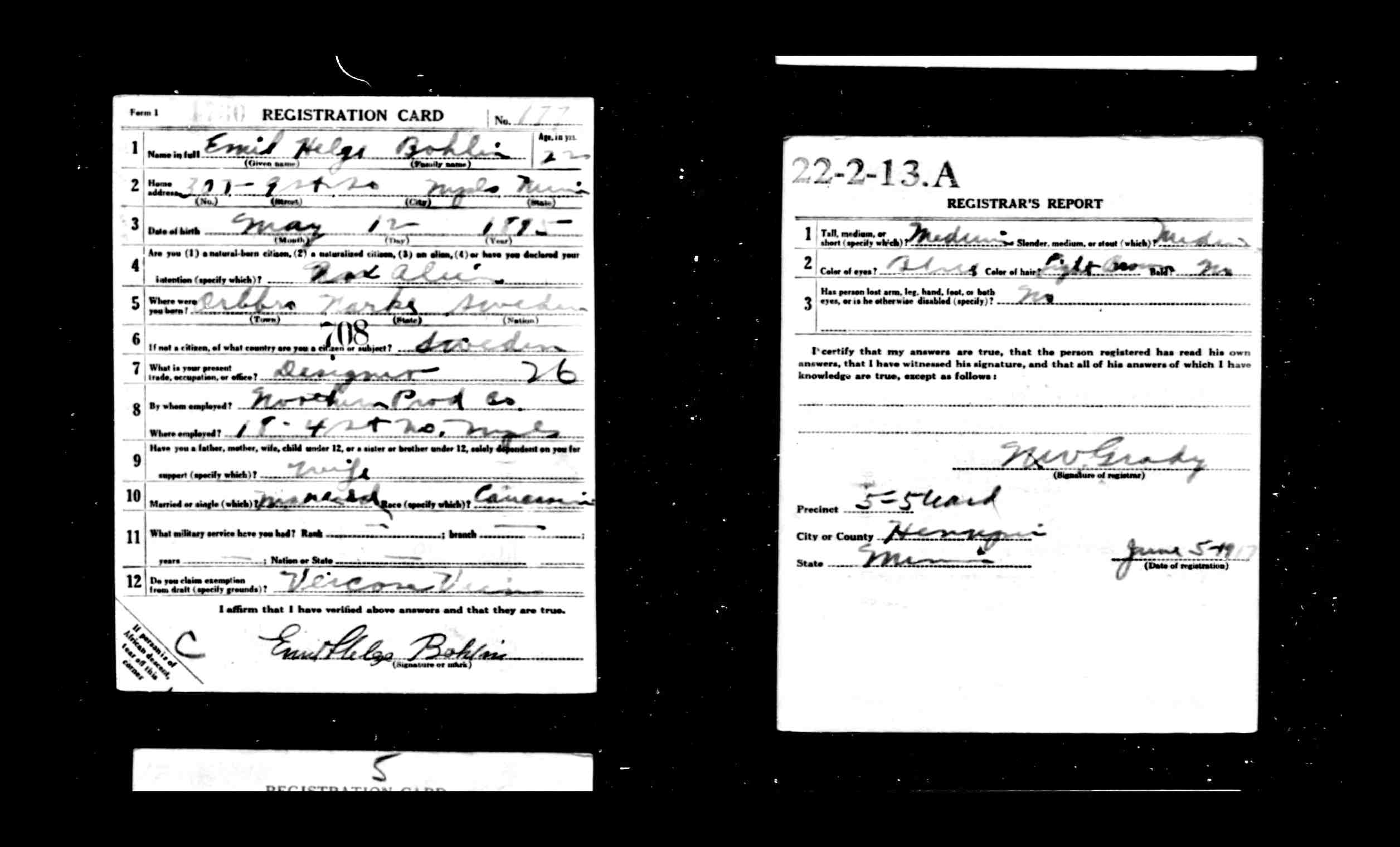 On June 5, 1917, Emil Helge Bohlin born May 12, 1895, in Orbbro, Narke, Sweden, and living at 307 9th Street, Minneapolis, Hennepin Co., MN, is a Designer for Northern Products Company located at 18 4th Street, Minneapolis, Hennepin Co., MN. He is married and claims military exemption due to varicose veins.
