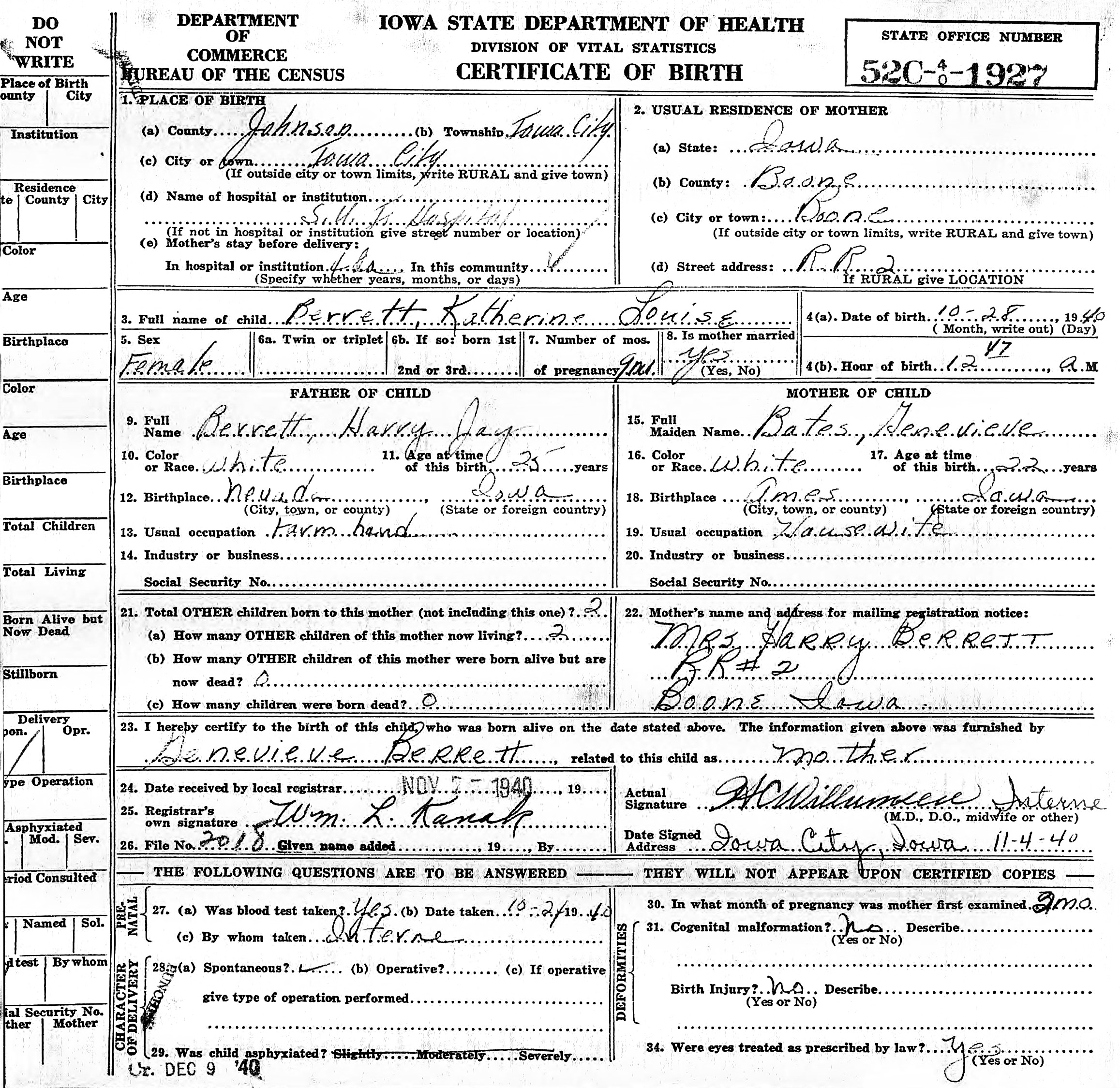 Katherine Louise "Kate" Berrett was born October 28, 1940, in S. U. I. Hospital, Iowa City, Johnson Co., IA.