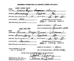 Robert Eugene Chaney (age 48) a divorcee, and Lorna Maye (Owen) Adams (age 39), a divorcee, were married June 25, 1982, in Laclede Co., MO. Robert's previous marriage ended in divorce on June 21, 1982. Loena's previous marriage ended in divorce on November 16, 1979.