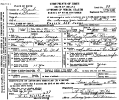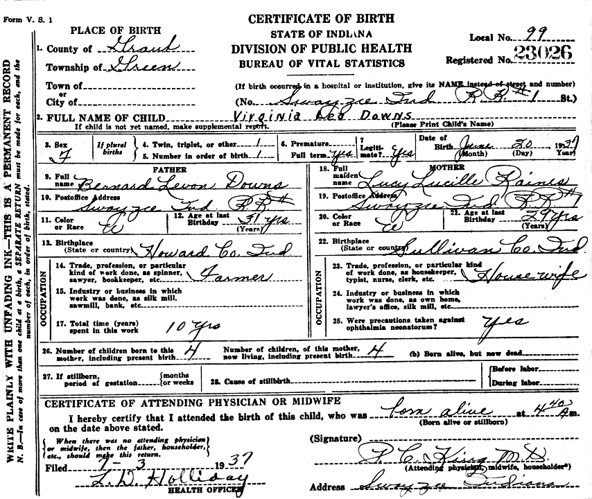 Virginia Lea Downs was born June 20, 1937, in Green Twp., Grant Co., IN. She is the daughter of Bernard Lewis Downs of Howard Co., IN, and Lucille "Lucy" Raines of Sullivan Co., IN.