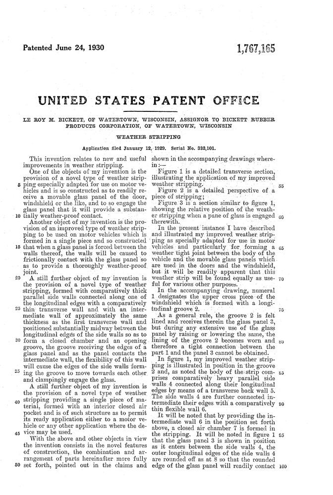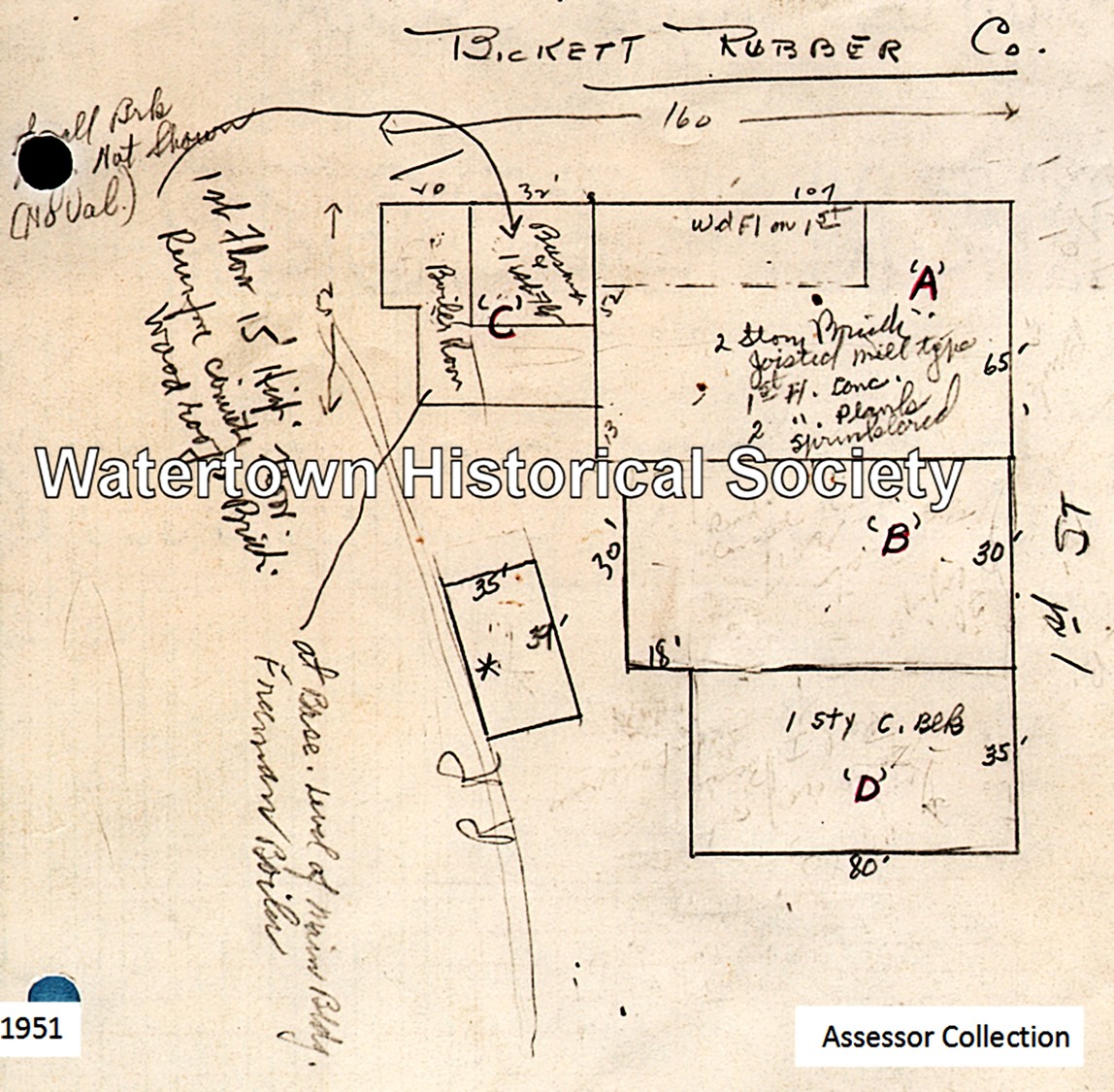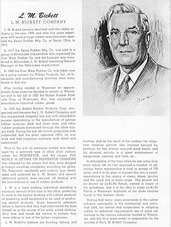 The rubber business in Watertown dates back to 1918 when a group of Watertown businessmen purchased controlling interest in the Pan-American Rubber Co., which had been operating in South Milwaukee, manufacturing a sponge rubber tube filler. After severing control of the company, the businessmen purchased a building at 600 South First Street in Watertown and moved the equipment from South Milwaukee to Watertown. The Pan-American Rubber Co. experienced considerable difficulty in disposing of its product; also, had some trouble in manufacturing sponge rubber fillers for the larger size tires, and as the result operations were not successful and profitable. In the fall of 1920 the group arranged for L. M. Bickett to come out to Watertown and, if possible give them some advice regarding the solving of their problems. At that time a meeting of all the stockholders was held to discuss the situation and to listen to the suggestions made by Mr. Bickett. After reviewing the entire situation Mr. Bickett suggested that they discontinue manufacture of the sponge rubber tire fillers and convert the factory into mechanical rubber goods, for which there was a great demand and orders could be secured without sales expense. After several conferences it was decided to liquidate the Pan-American Rubber Co. and to organize a new mechanical rubber goods company, and although L. M. Bickett was at that time employed by the Rubtex Products Corp., he agreed to resign and accept a position with the new corporation to be organized, and accordingly, in April of 1921 the Bickett Rubber Products Corp. was organized, the Pan-American Rubber Co. was liquidated and immediately thereafter the newly organized Bickett Rubber Products Corp. started operations.