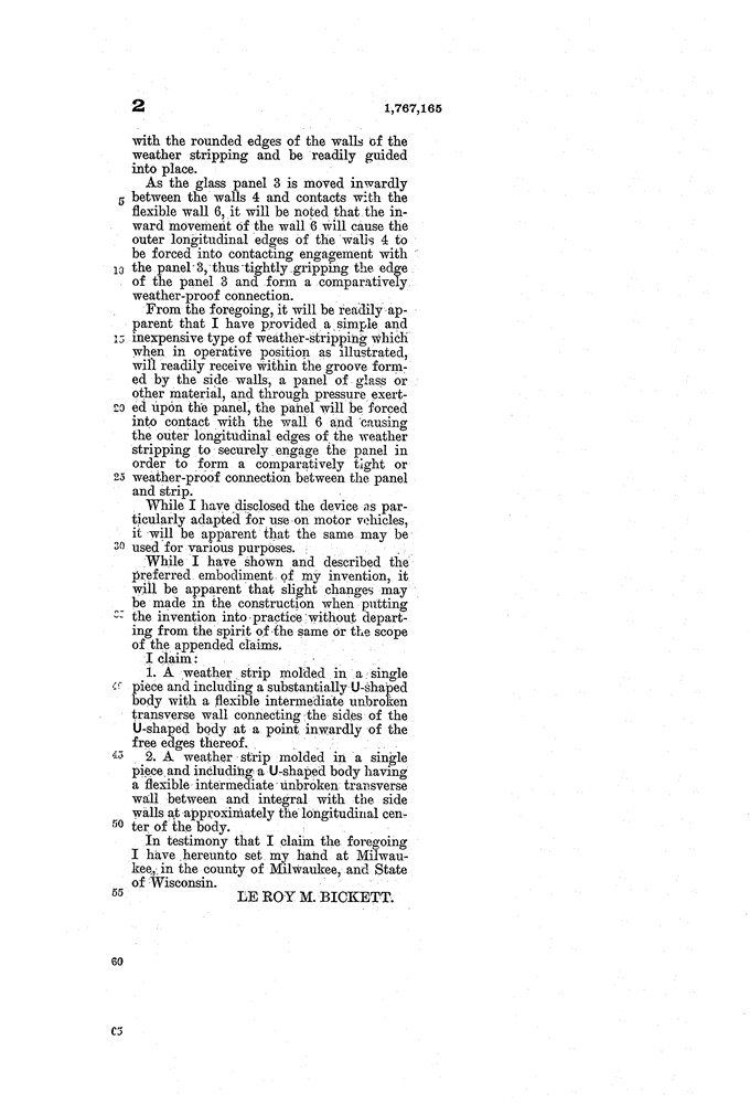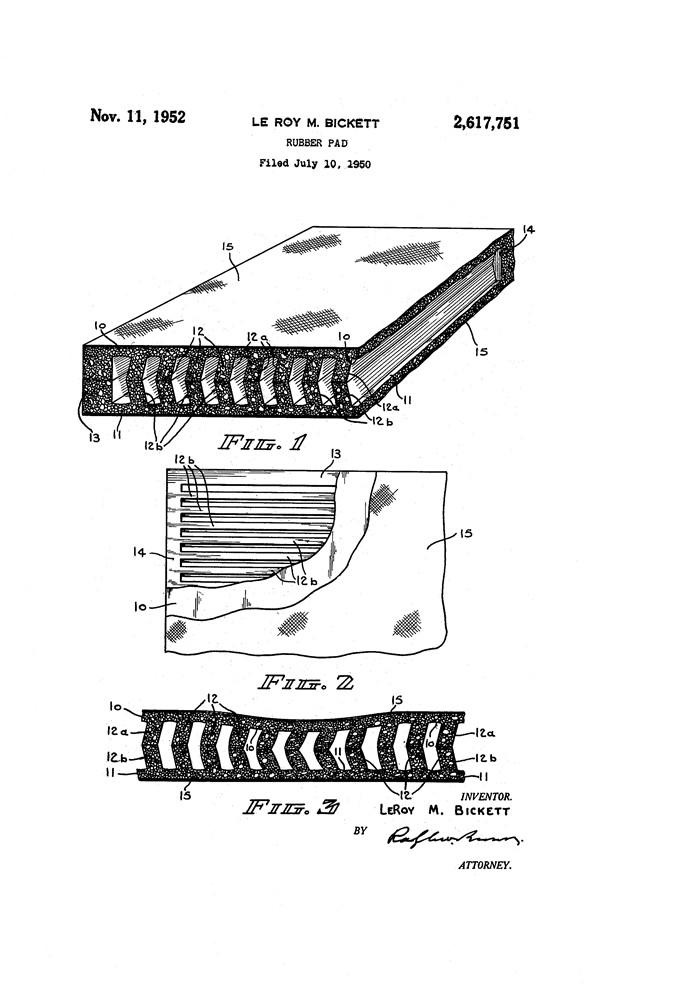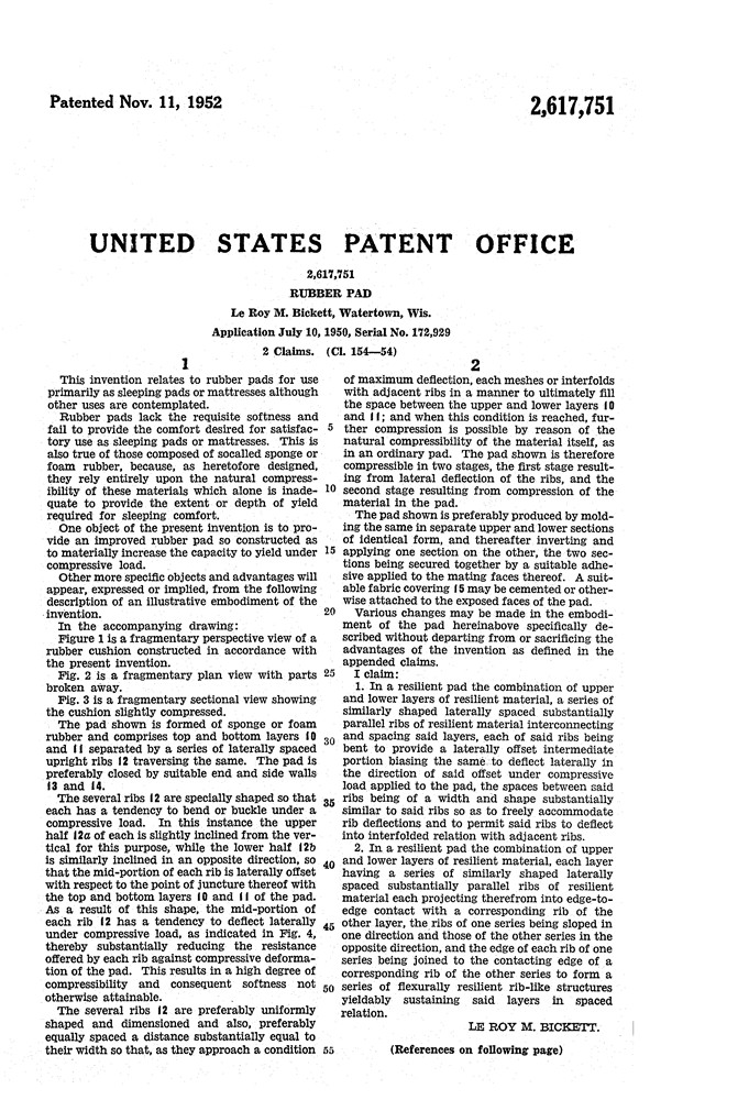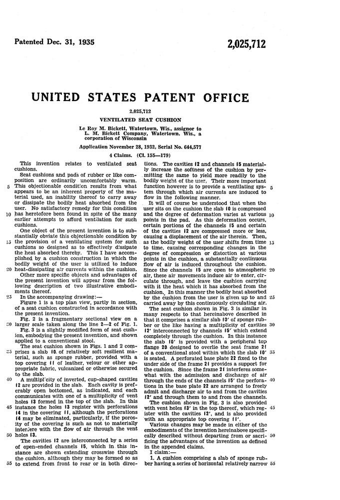 In 1934, L. M. Bickett secured a patent on a new and greatly improved type of seat cushion. Although he was offered $100,000 for this patent three days after it was issued it was assigned to the L. M. Bickett Company at a total cost of $258, which represented the lawyers' fees in securing the patent. The trade accepted the new ventilated type of cushion, which was named �Respirator,� and within five years time was being sold and used in approximately 45 foreign countries. This business continued to increase until the war in December, 1941, at which time the government prohibited the use of rubber in seat cushions and all other non-essential products reserving everything or wartime needs. The rubber restraining order continued until the conclusion of the war in 1945. In order to keep the factory in operation essential war orders were secured and the factory operated approximately 18 hours per day during the years 1944 and 1945. At the conclusion of World War II all restrictions on rubber were removed and the company resumed production on civilian products and there has been no interference with production since the war ended and the company has been in continuous profitable production ever since.