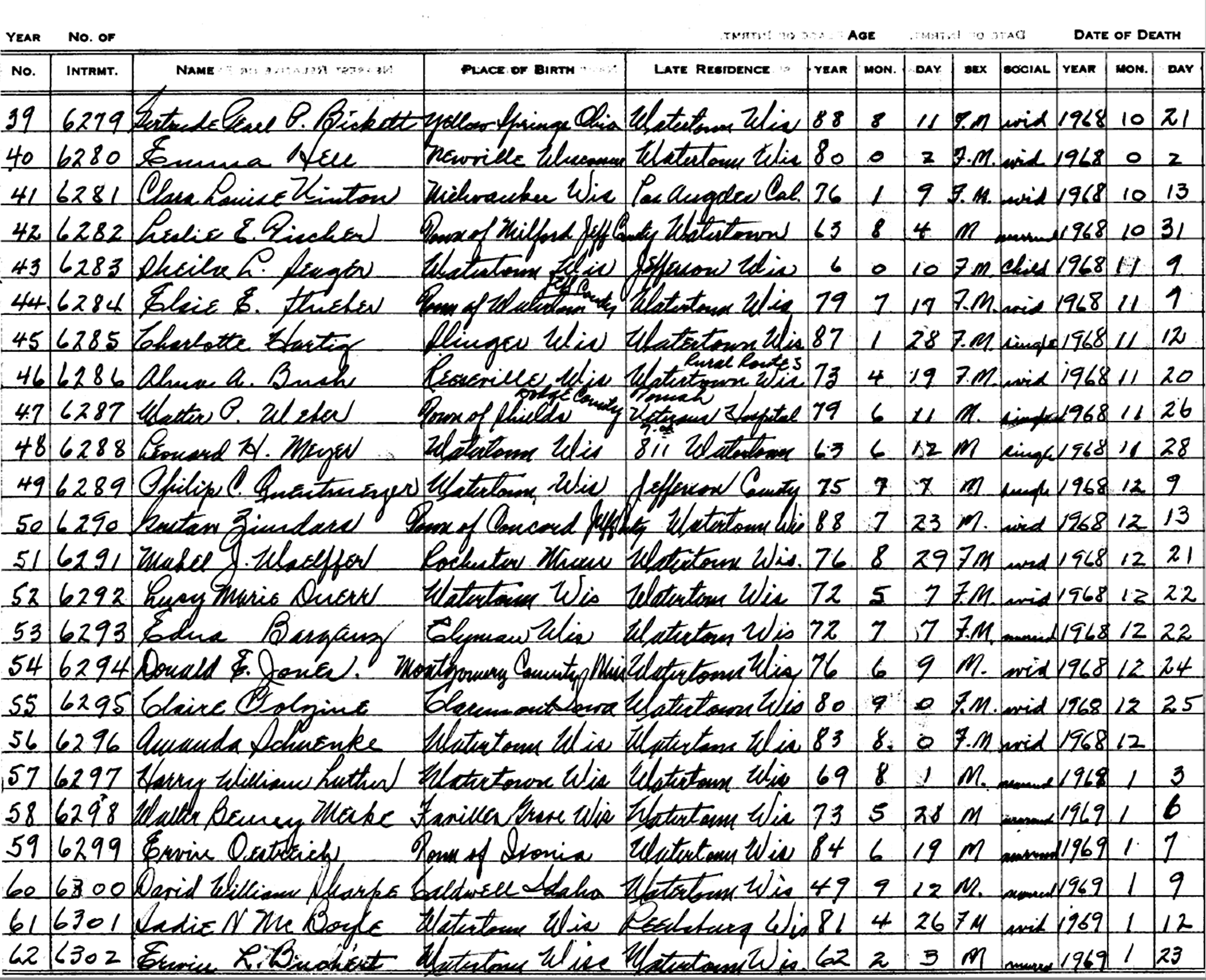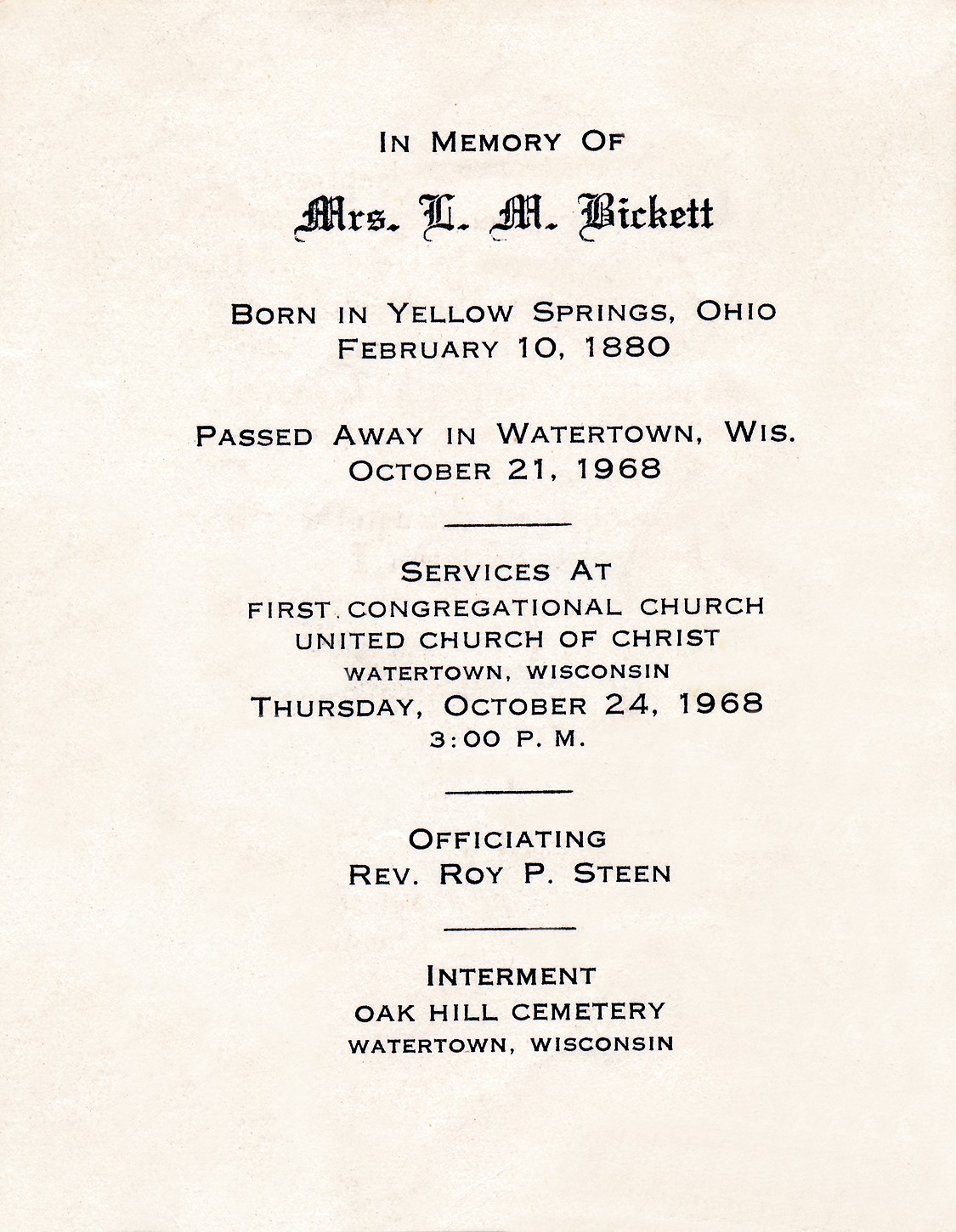 - Ruth Gertrude Bickett : Born December 23, 1916, in the Village of Yellow Springs, Miami Twp., Greene Co., OH; Died February 5, 1987, at Watertown Memorial Hospital, Watertown, Dodge Co., WI (age 70). Inurnment in Sunland Memorial Park, Sun City, Maricopa Co., AZ. Married March 2, 1940, in Dubuque, Dubuque Co., IA, to Wilbur Almo "Bill" Larson: Born June 14, 1913, in the Town of Farmington, Waupaca Co., WI; Died October 19, 1996, at his home, Las Vegas, Clark Co., NV (age 83). Inurnment in Sunland Memorial Park, Sun City, Maricopa Co., AZ.