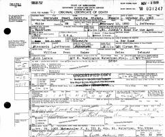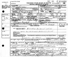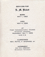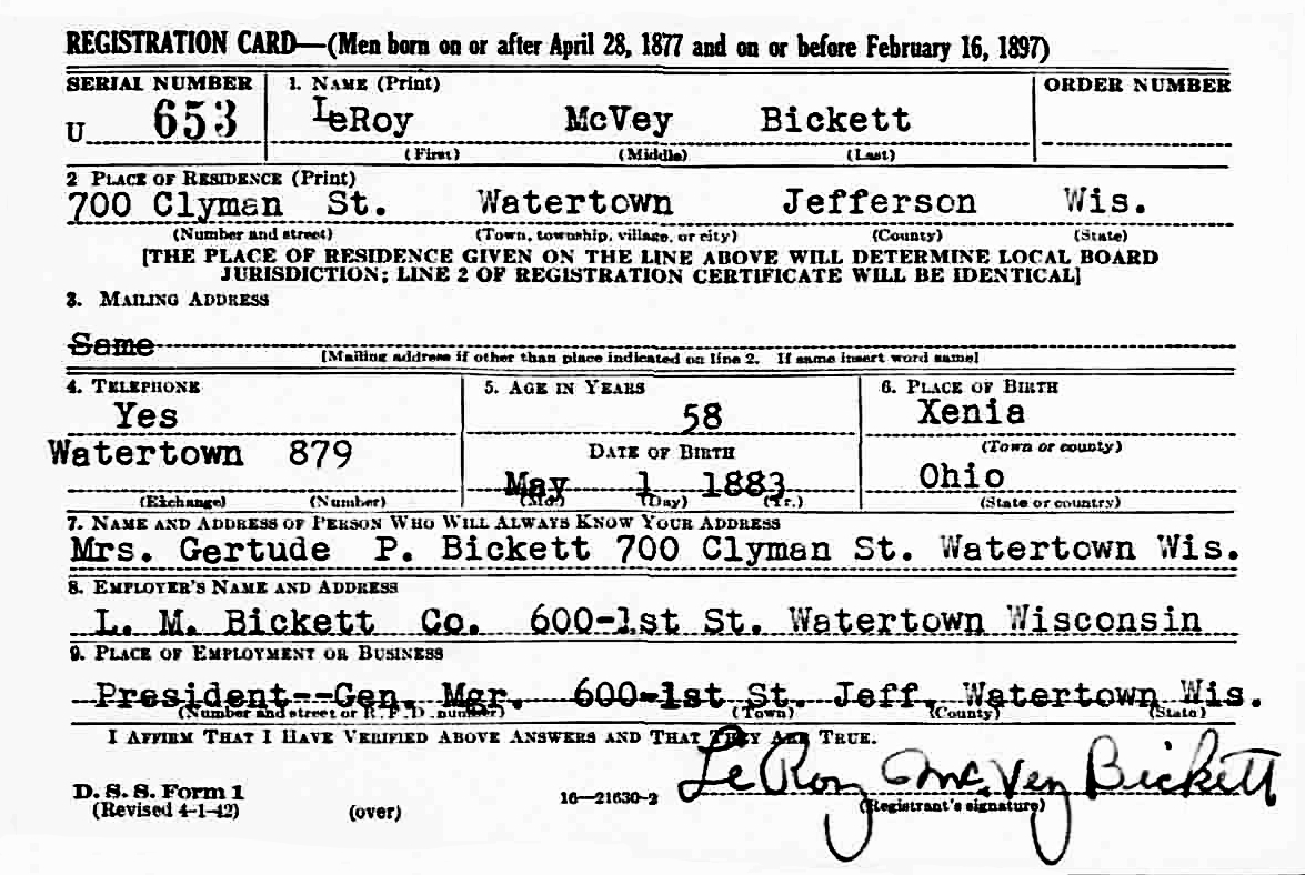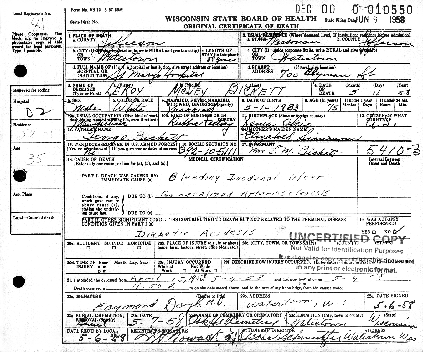LeRoy McVey "Roy" Bickett was born May 1, 1883, in Xenia Twp., Greene Co., OH, and died May 4, 1958, at St. Mary's Hospital, Watertown, Jefferson Co., WI, at age 75. Buried in Oak Hill Cemetery, Watertown, Jefferson Co., WI. Primary cause of death: Bleeding Duodenal Ulcer due to Generalized Arteriosclerosis. Secondary cause of death: Diabetic Acidosis. He is the son of George McVey Bickett of Xenia Twp., Greene Co., OH, and Ruth Elizabeth "Lizzie" Simons of Clark Co., OH. He completed 8 years of secondary school in Xenia, Greene Co., OH.