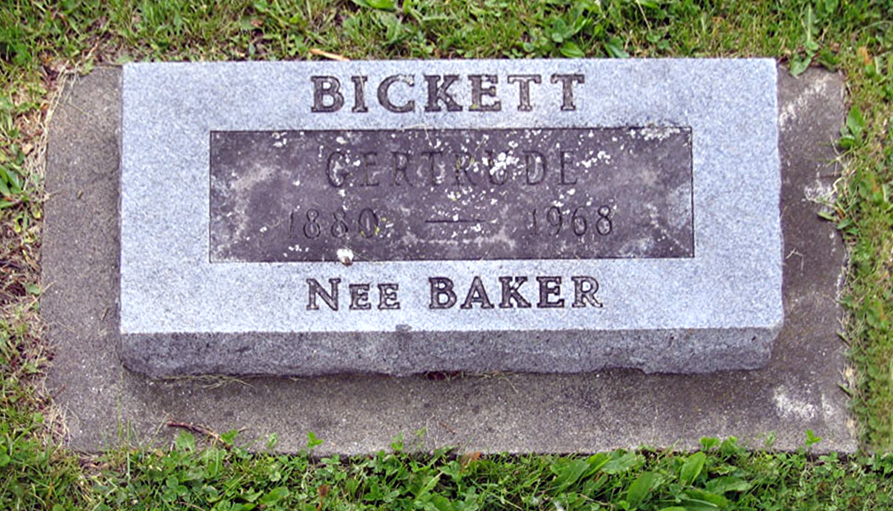 Gertrude Pearl Patricia "Gertie" (Baker) Bickett is buried in the Bickett/Fiegel plot, Grave 8, Lot 6, Block 32, Oak Hill Cemetery, Watertown, Jefferson Co., WI.