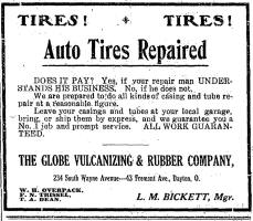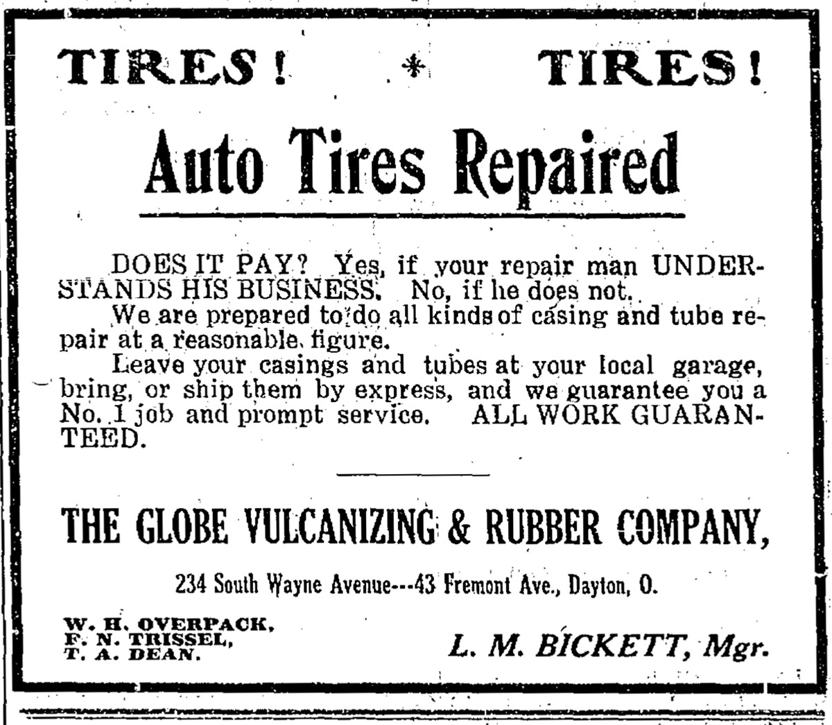 Messrs. Roy Bickett and Archie Dean, two well known Xenia men, have gone into business in Dayton, having become members of the Globe Vulcanizing & Rubber Company of that city. Mr. Bickett, who has been employed for some time by a big rubber plant at Akron, is the manager of the Dayton company. The other members of the firm are Dayton men named W. H. Overpack and F. N. Trissel.